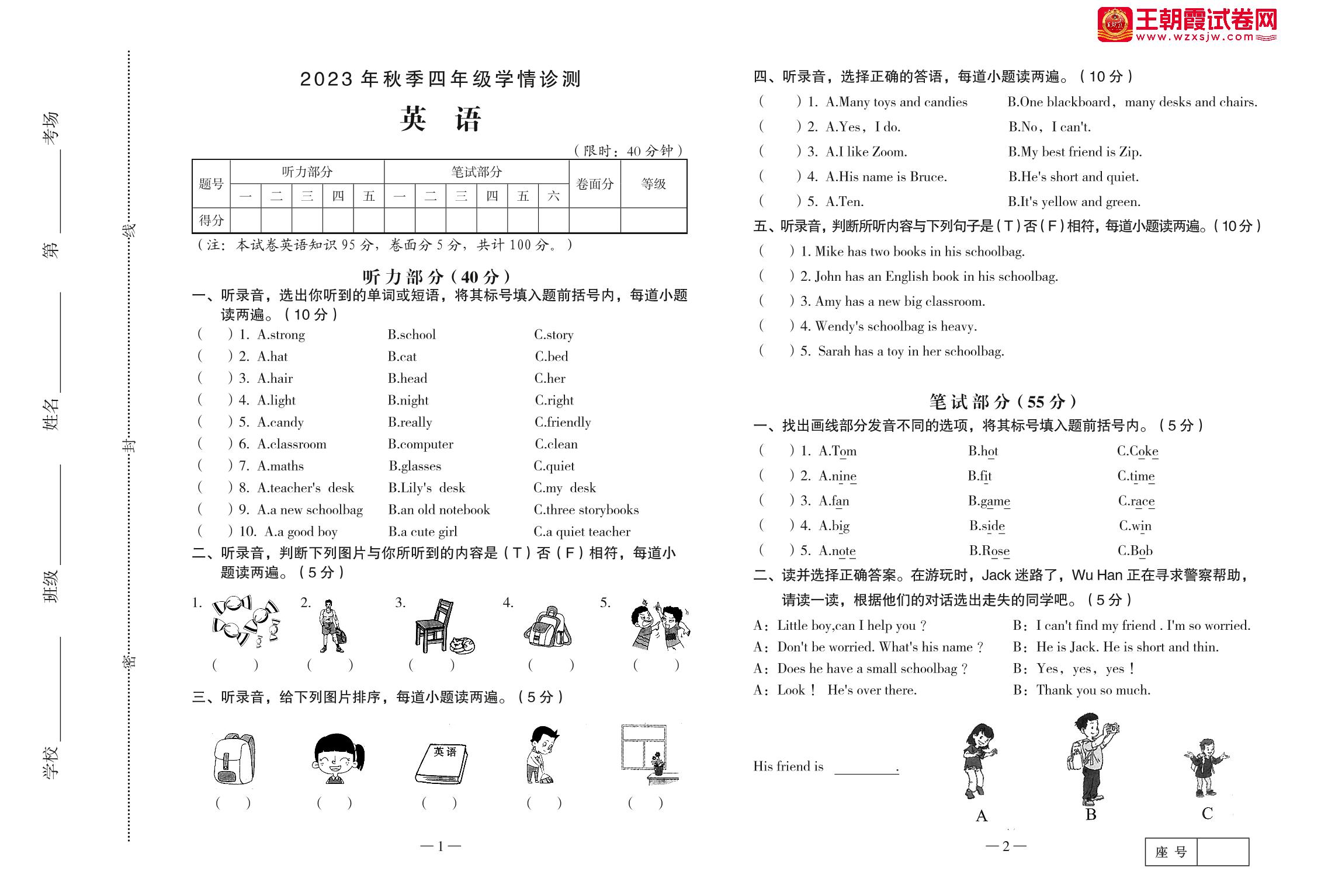 四年级英语人教PEP版(三起始)上册期中卷