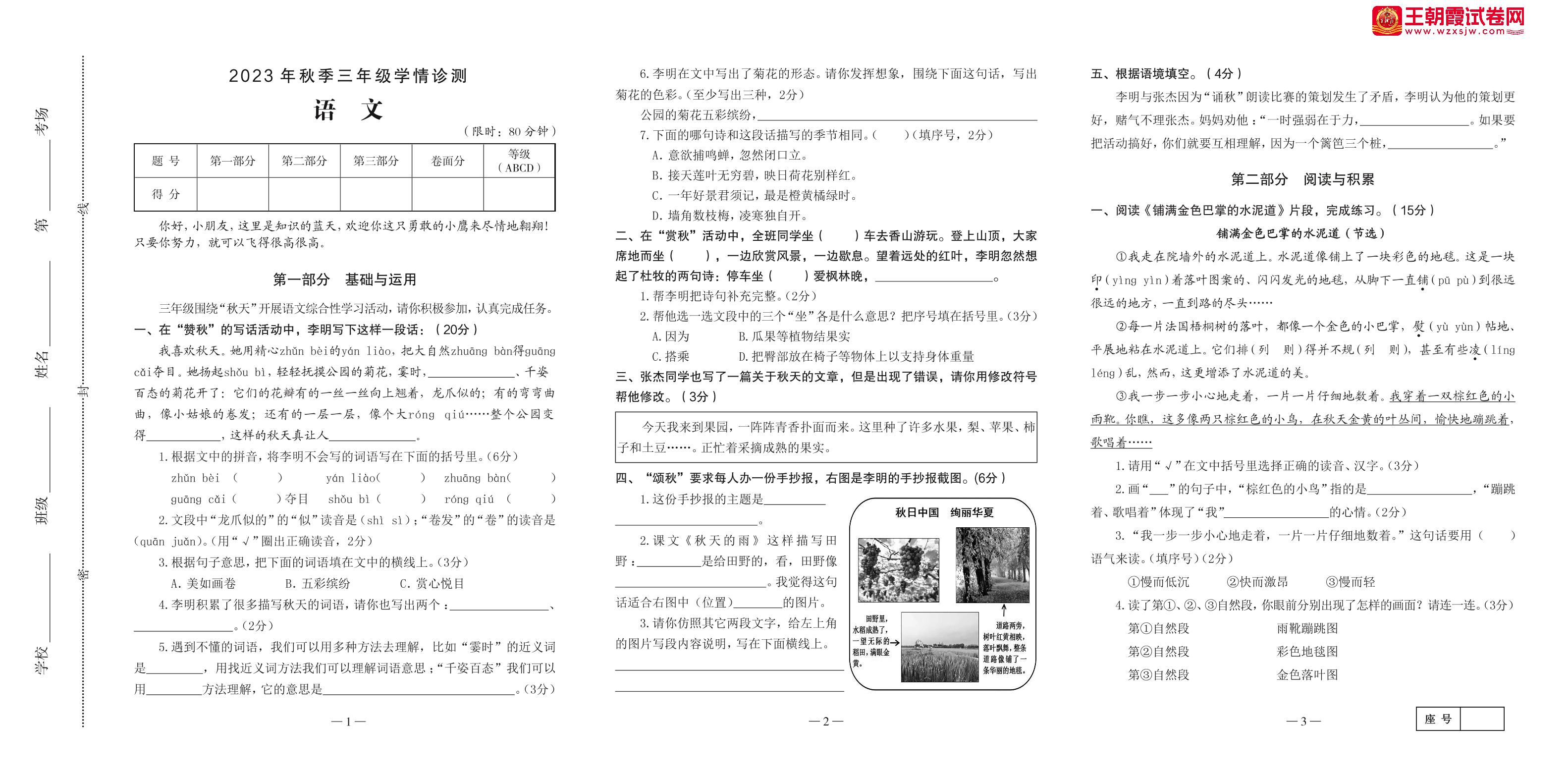 河南省三门峡市湖滨区2023-2024学年上学期期中学情诊测试题三年级语文(人教版)