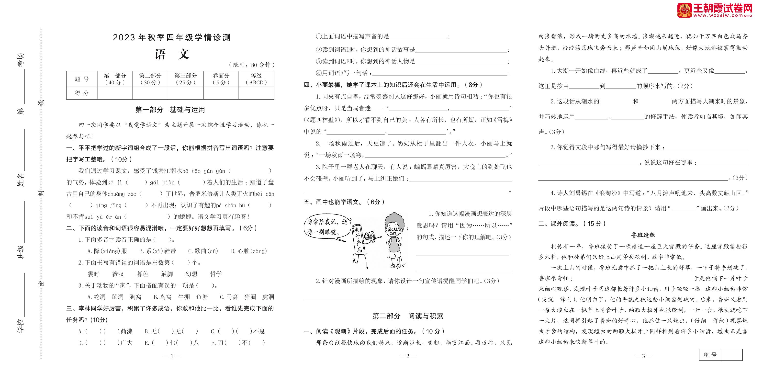 河南省三门峡市湖滨区2023-2024学年上学期期中学情诊测试题四年级语文(人教版)