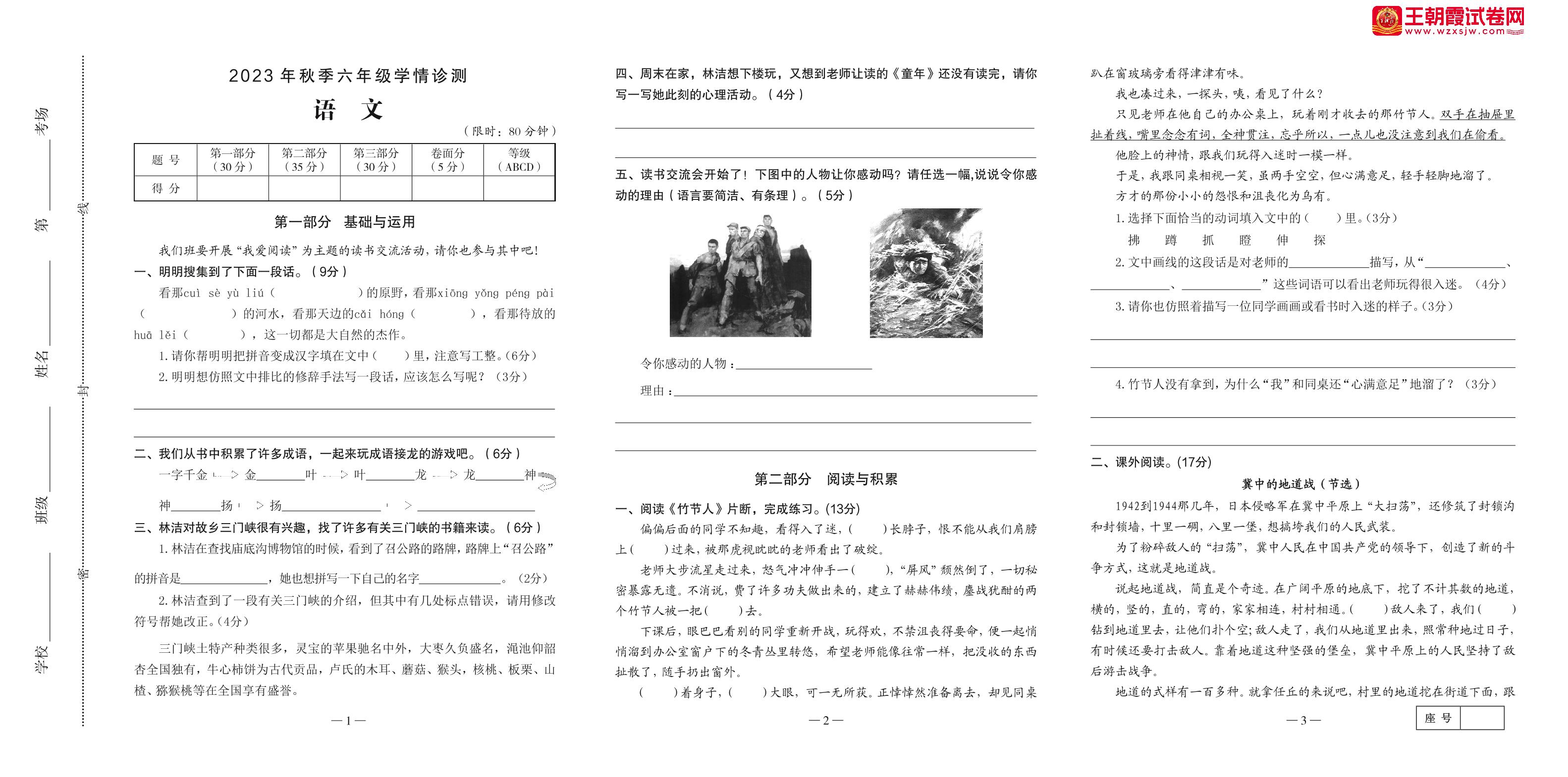 河南省三门峡市湖滨区2023-2024学年上学期期中学情诊测试题六年级语文(人教版)