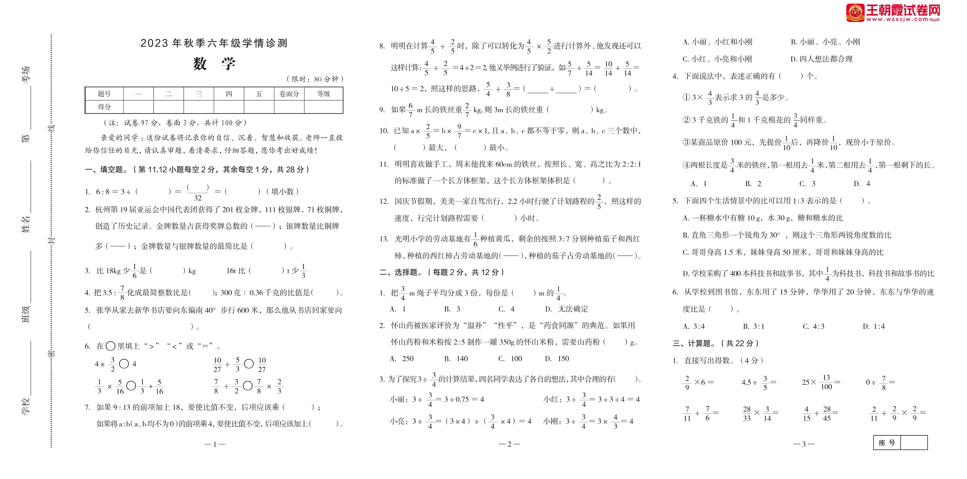 河南省三门峡市湖滨区2023-2024学年上学期期中学情诊测试题六年级数学(人教版)