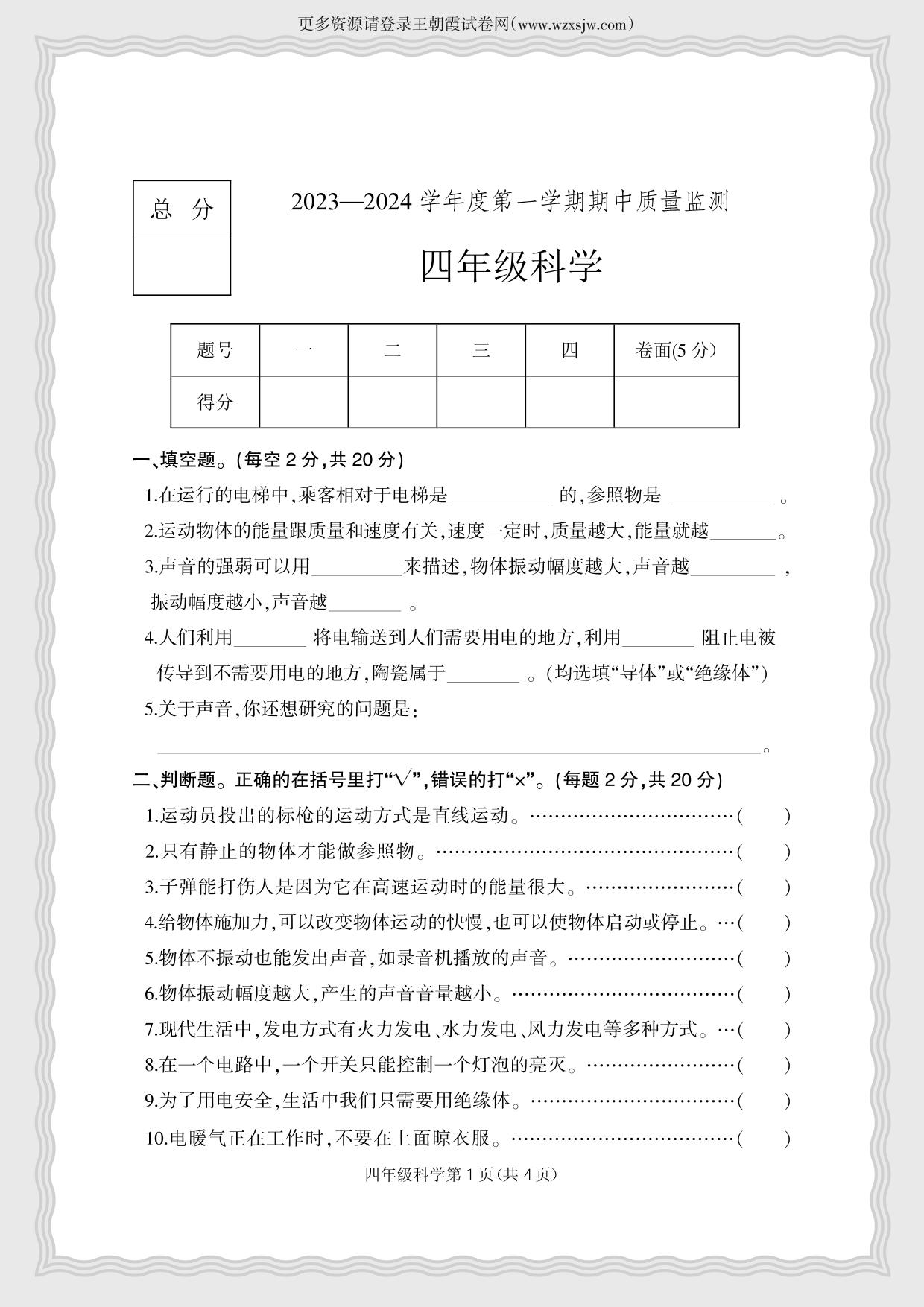 河北省保定市2023-2024学年度第一学期期中质量监测四年级科学(冀人版)