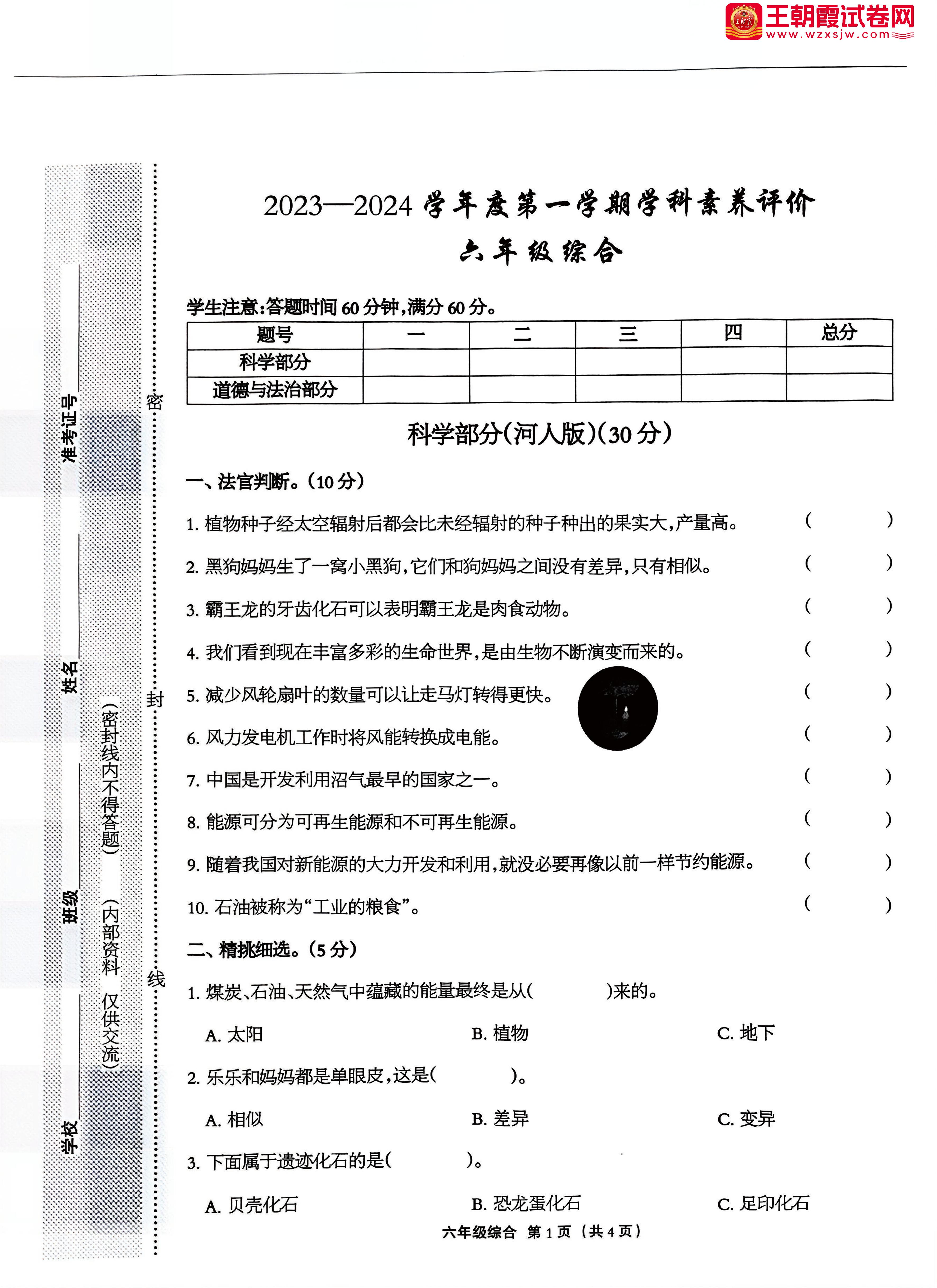 河北省保定市阜平县2023-2024学年度第一学期期中学科素养评价六年级科学道法综合试卷