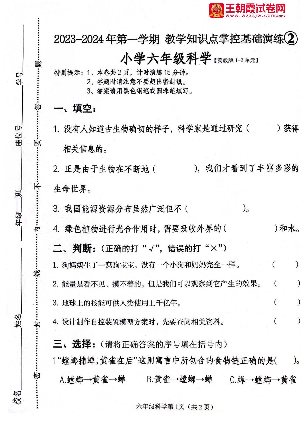 河北省唐山市玉田县2023-2024学年第一学期教学知识点掌控基础演练②(期中)六年级科学(冀人版)