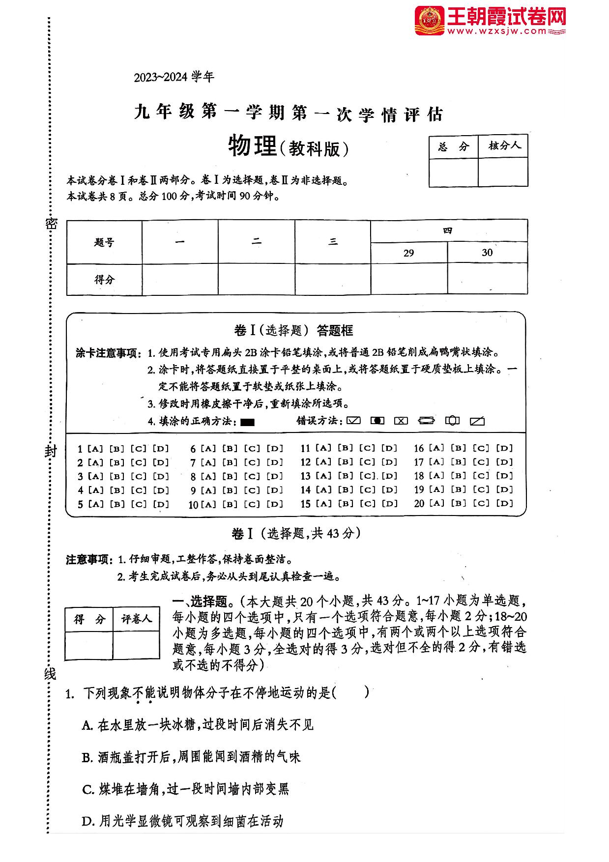 河北省邢台市威县2023-2024学年第一学期第一次学情评估(月考)九年级物理(教科版)