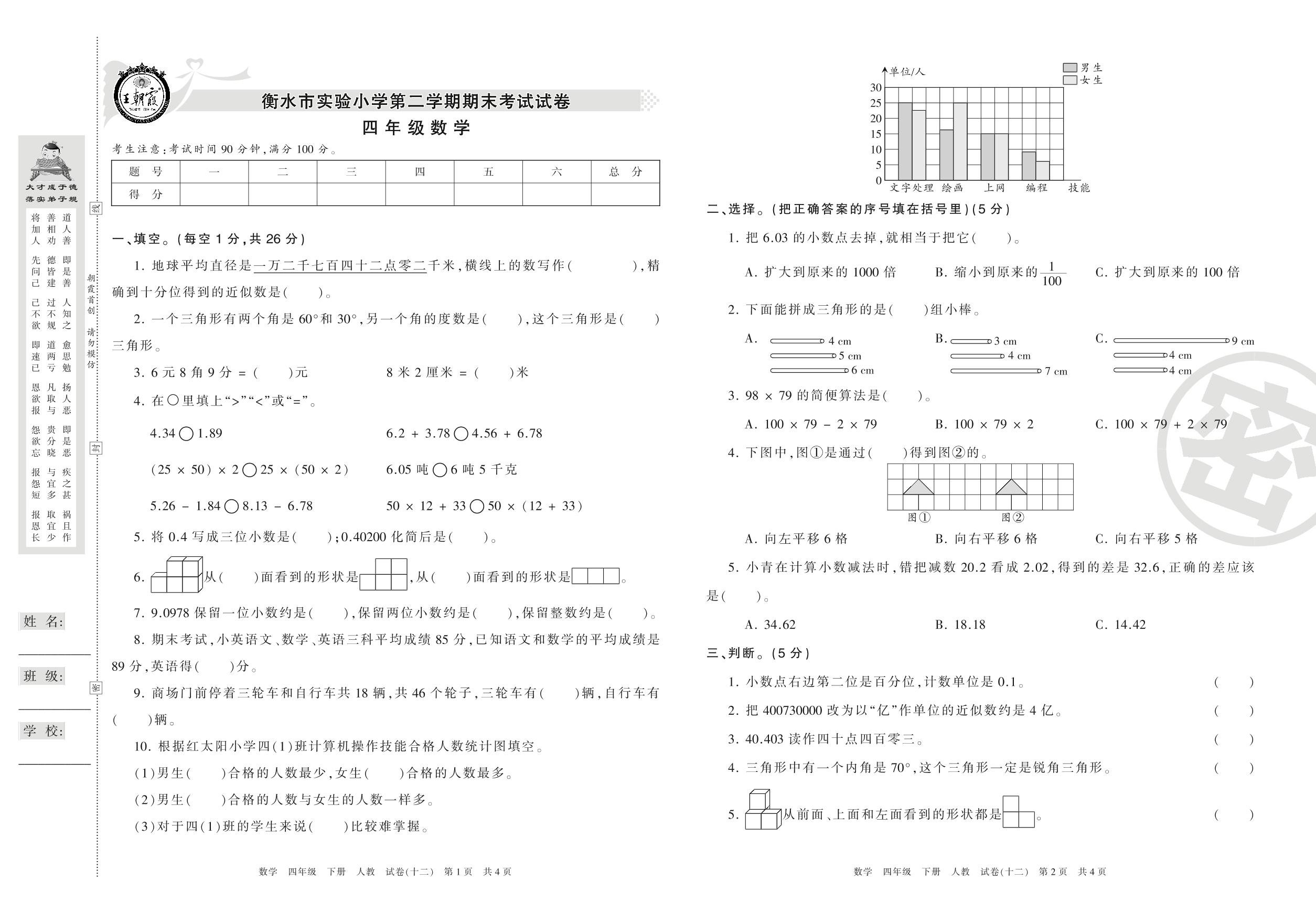 2015-2016学年第二学期衡水市实验小学四年级数学试卷(人教版)【12】