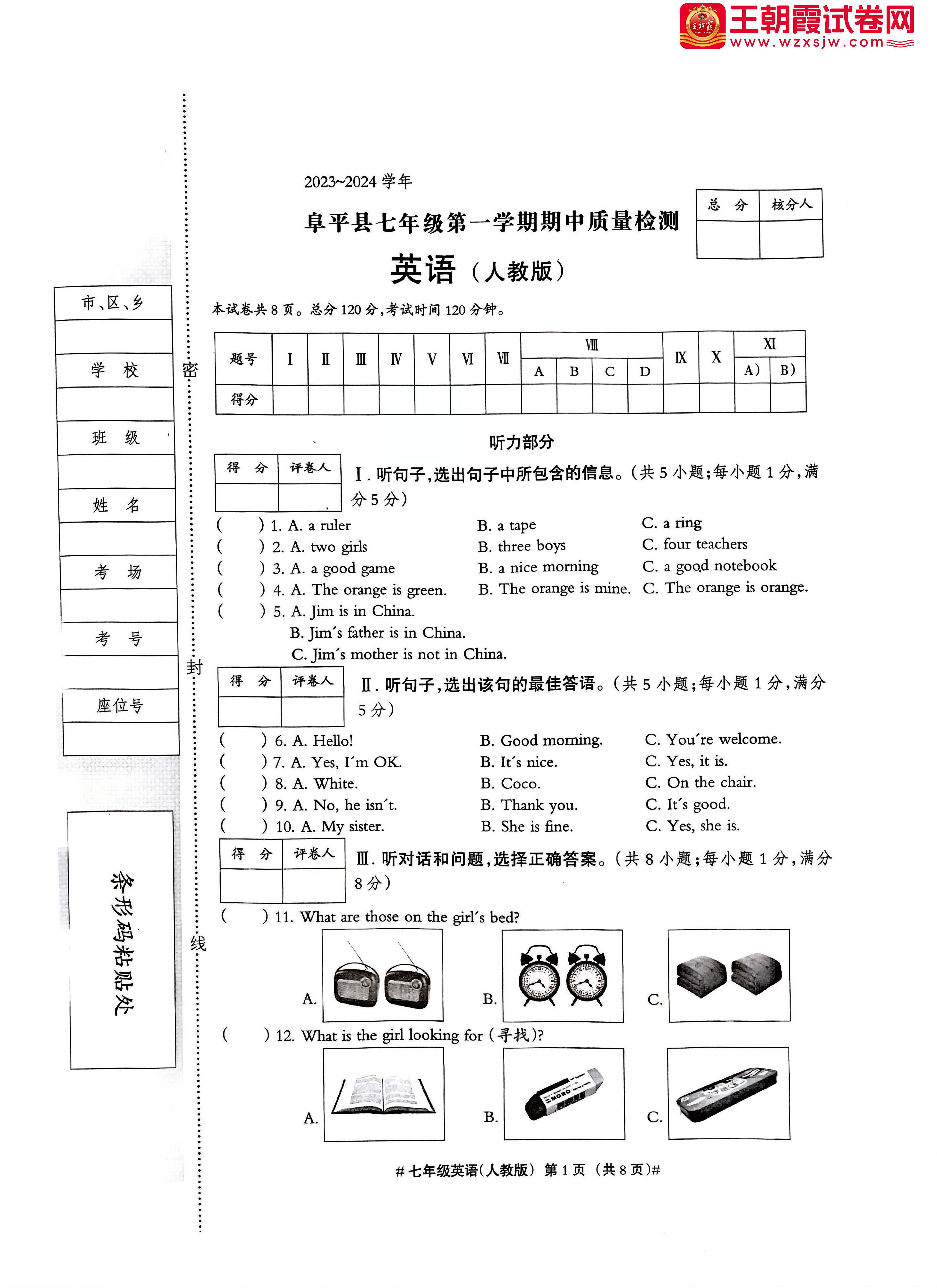 河北省保定市阜平县2023-2024学年第一学期期中质量检测七年级英语(人教版)