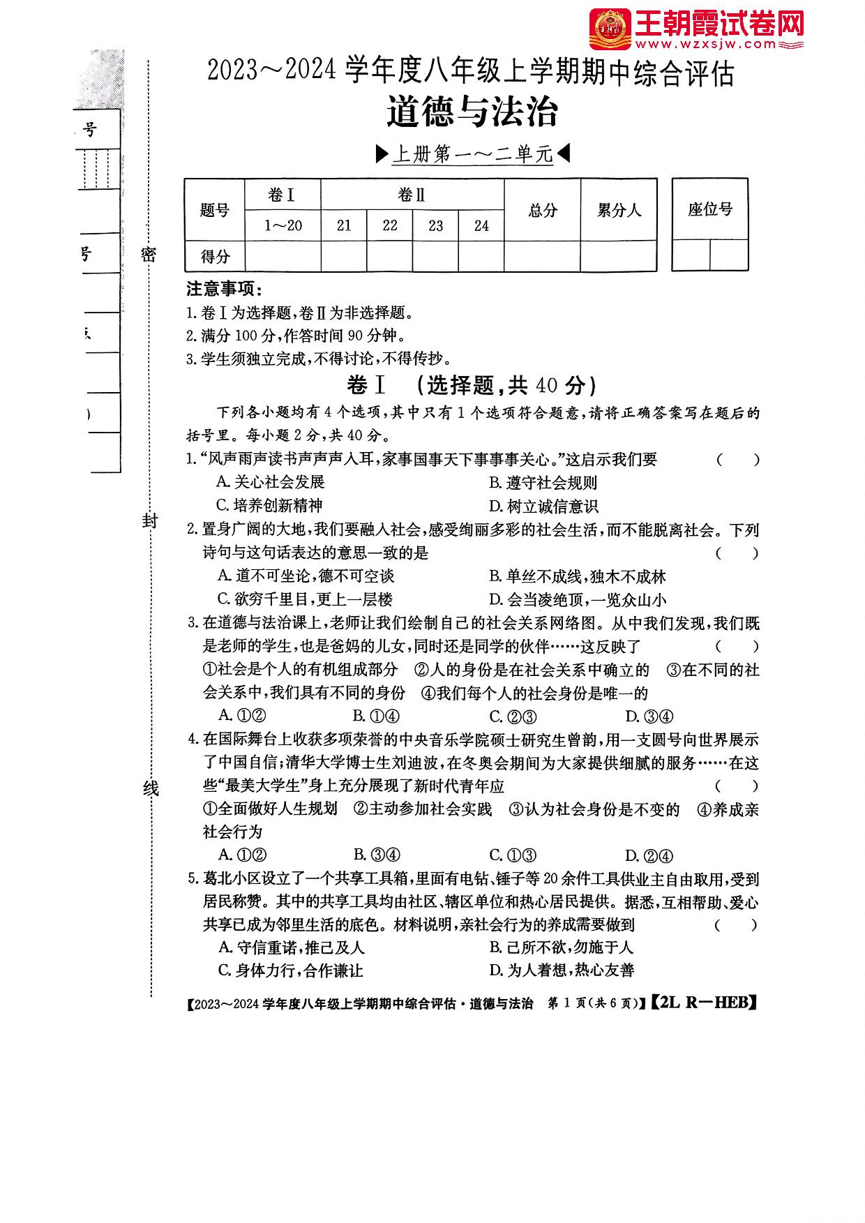 八年级道德与法治人教版上册期中卷
