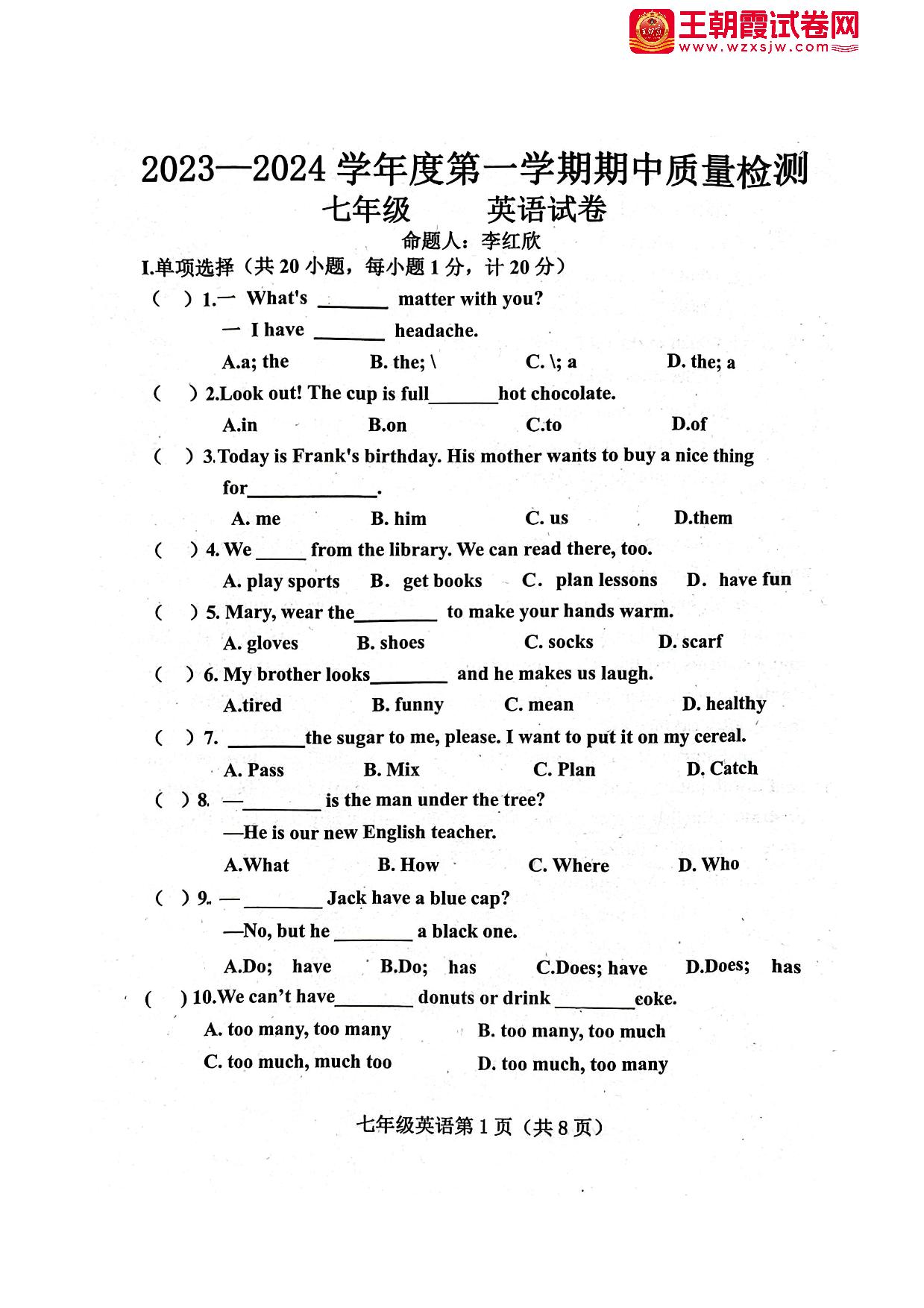 河北省保定市曲阳县2023-2024学年度第一学期期中质量检测七年级英语(冀教版)