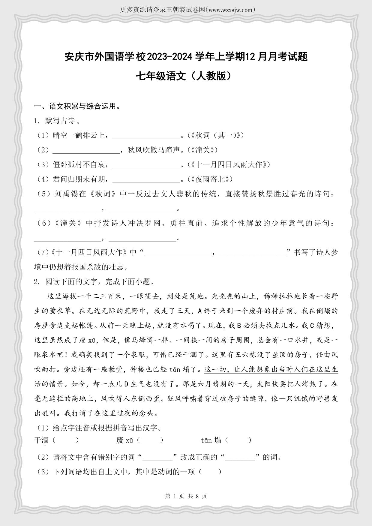 安徽省安庆市外国语学校2023-2024学年上学期12月月考试题七年级语文(人教版)