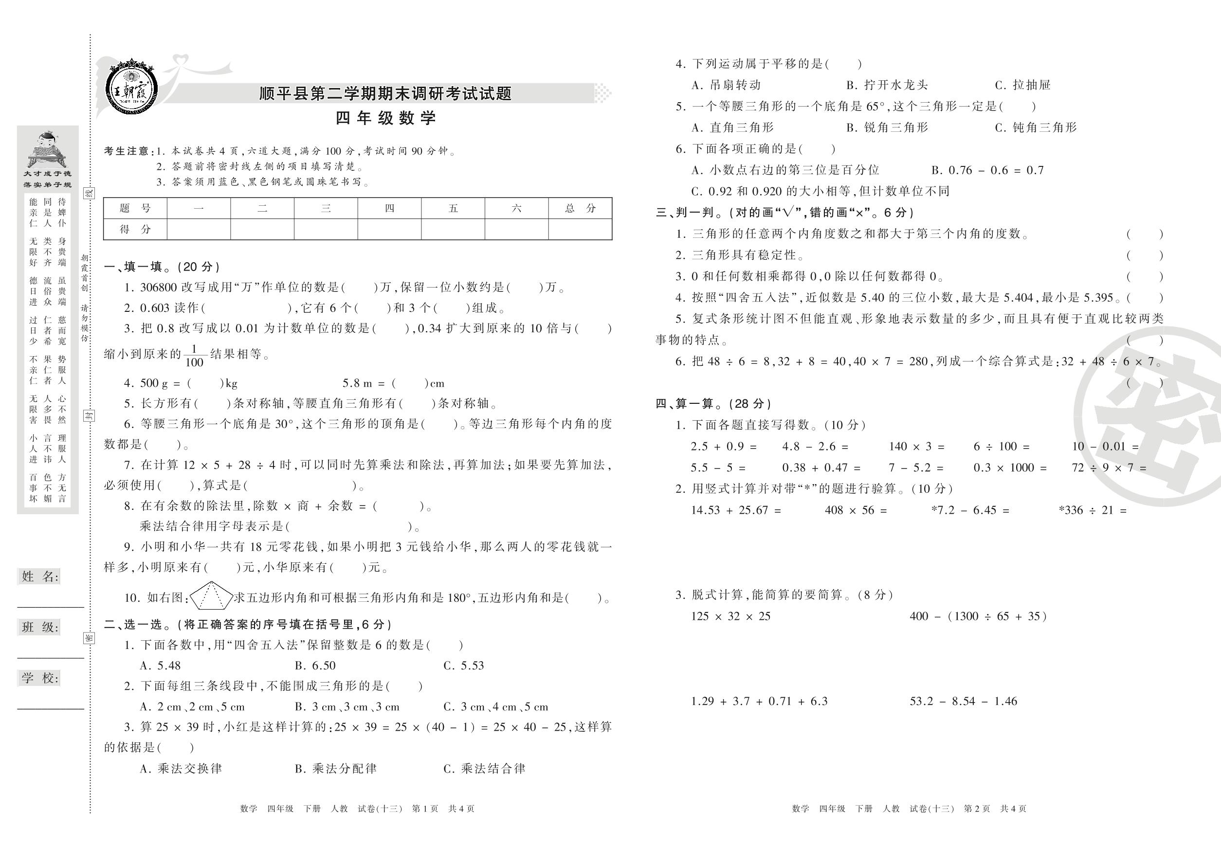2015-2016学年第二学期保定市顺平县四年级数学试卷(人教版)【13】
