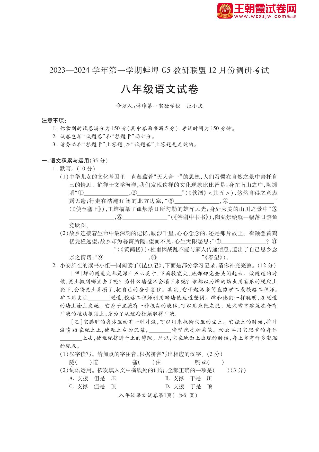 安徽省蚌埠市G5教研联盟2023-2024学年第一学期12月月考试卷八年级语文(人教版)