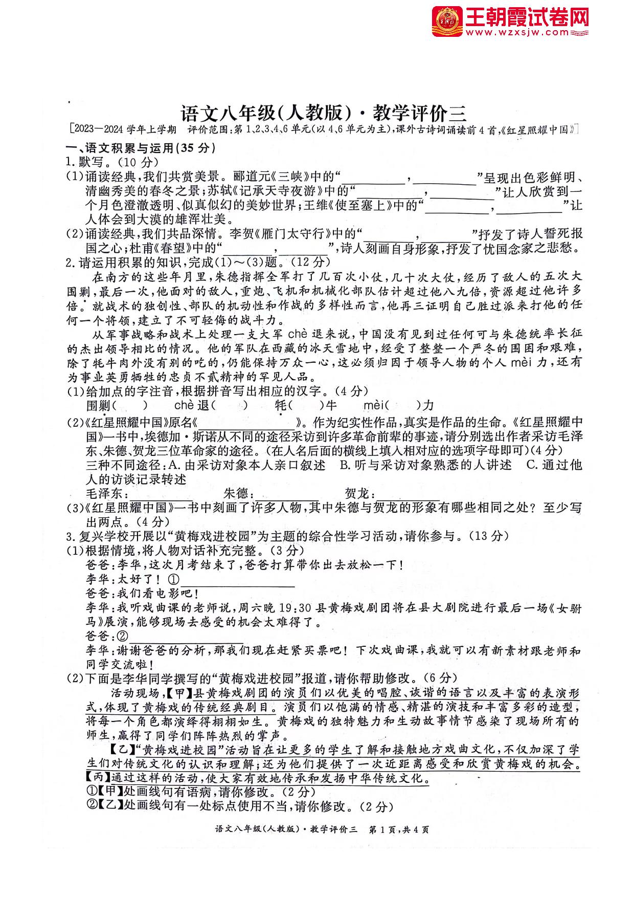 安徽省淮北市五校联考2023-2024学年上学期12月月考试题八年级语文(人教版)