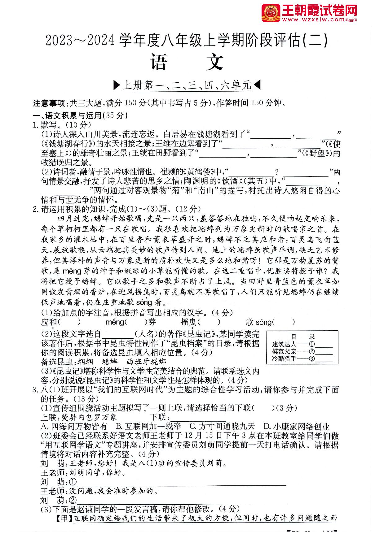 安徽省芜湖市无为市多校联考2023-2024学年上学期12月月考试题八年级语文(人教版)