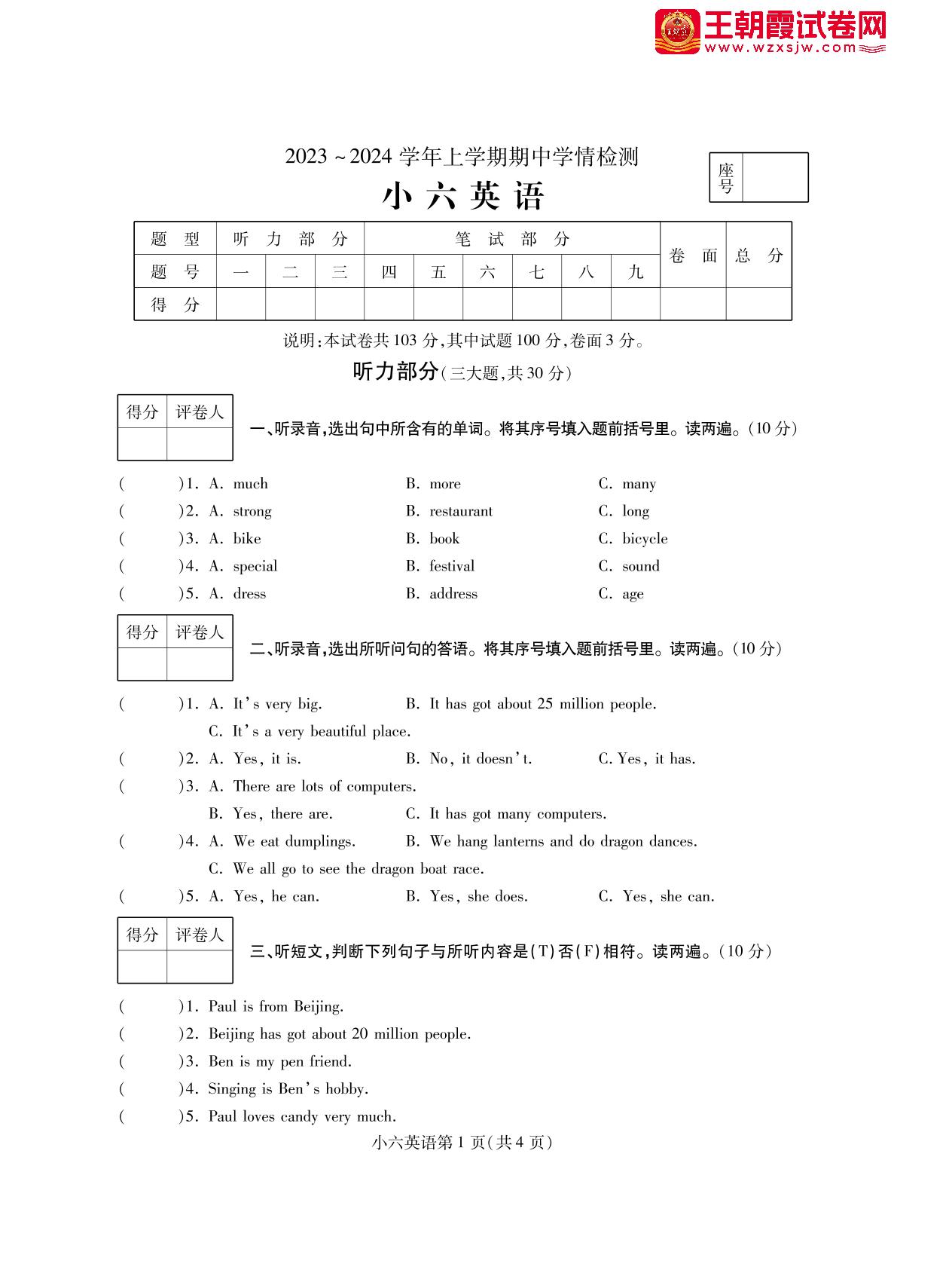 河南省平顶山市郏县2023-2024学年上学期期中学情检测试题六年级英语(外研版·三起始)【无听力音频】