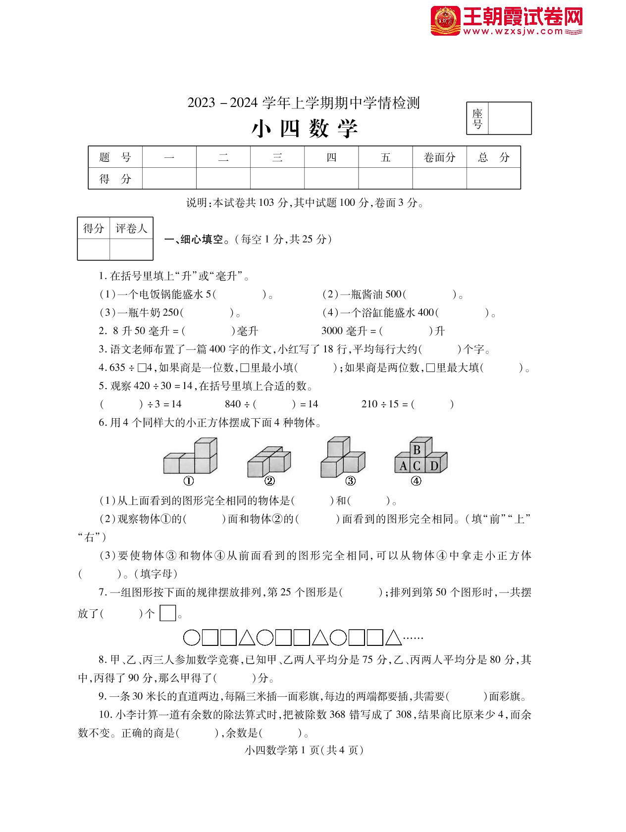 河南省平顶山市郏县2023-2024学年上学期期中学情检测试题四年级数学(苏教版)