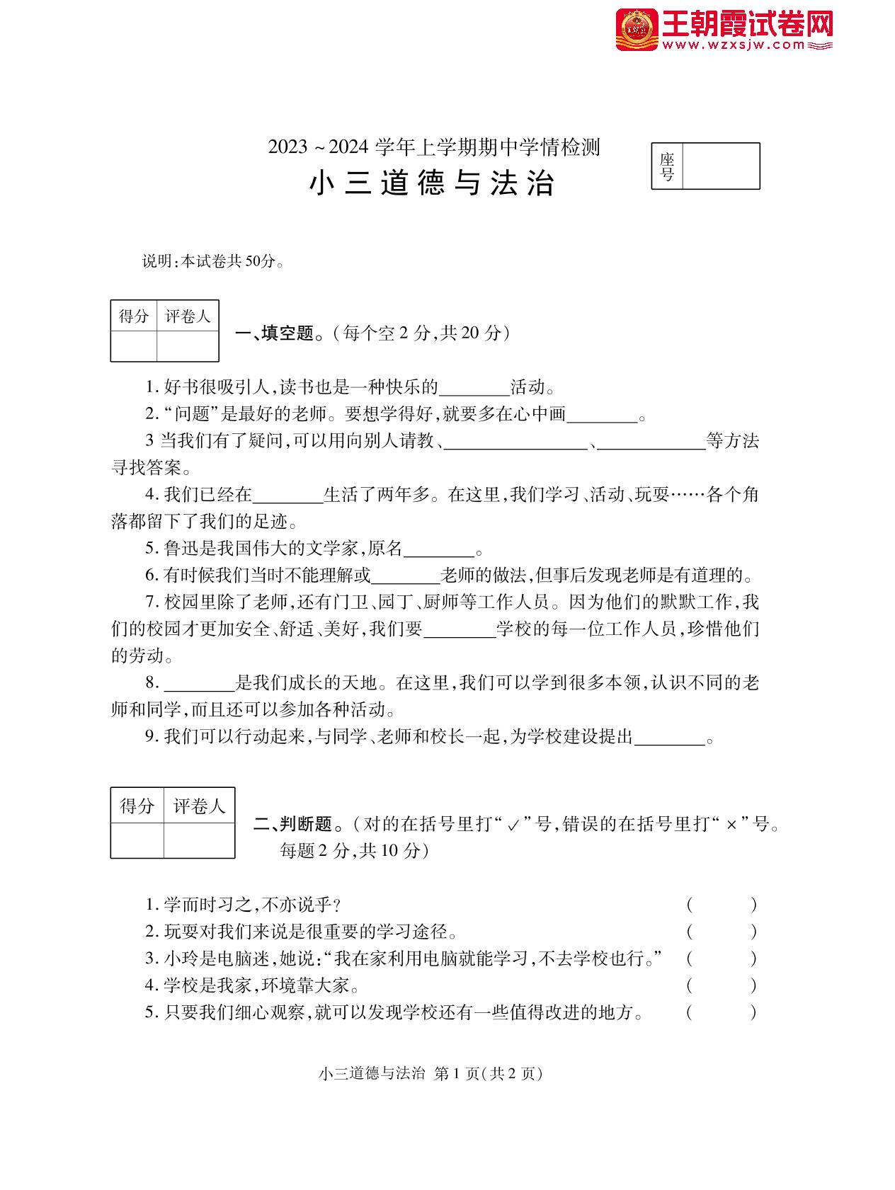 河南省平顶山市郏县2023-2024学年上学期期中学情检测试题三年级道德与法治(人教版)