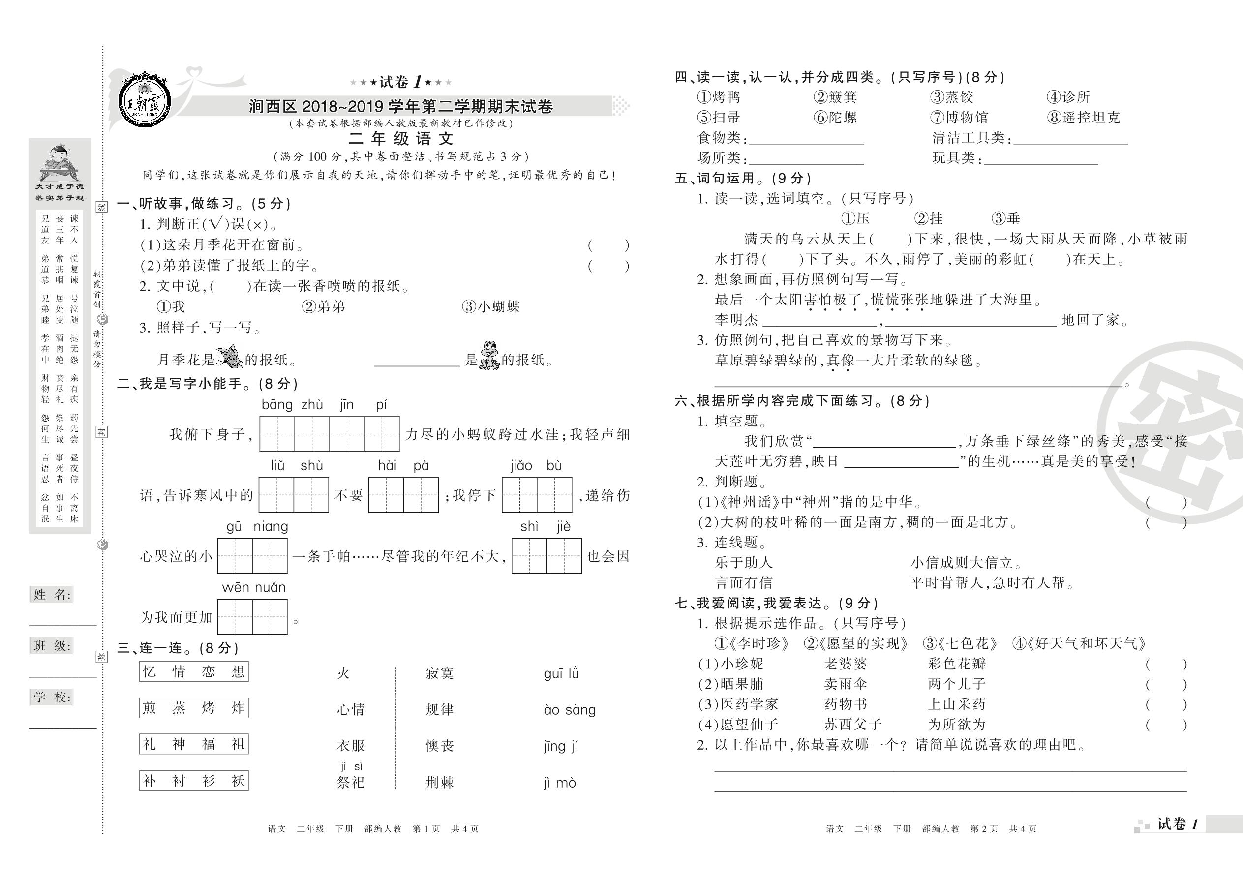 2018-2019学年第二学期洛阳市涧西区二年级语文试卷(人教版)【1】