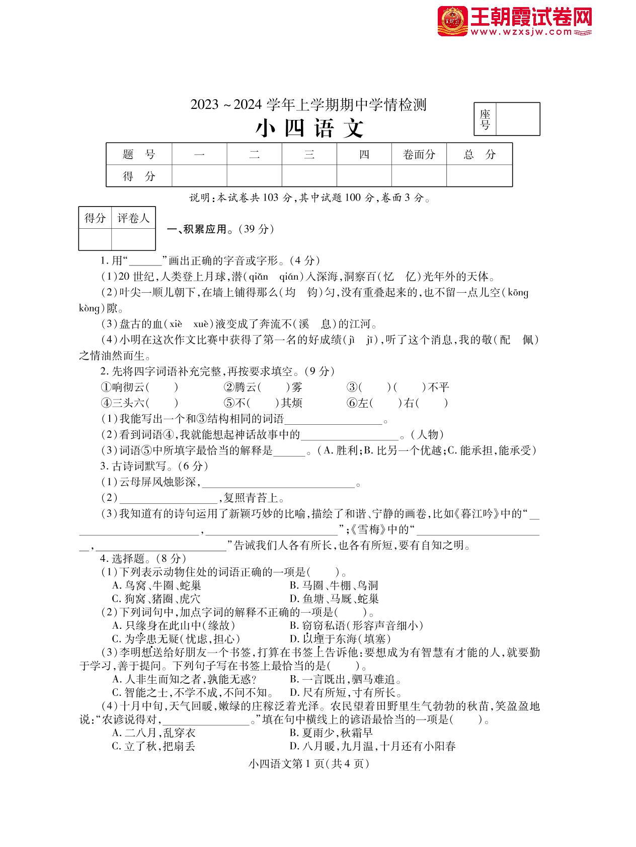 四年级语文人教版上册期中卷