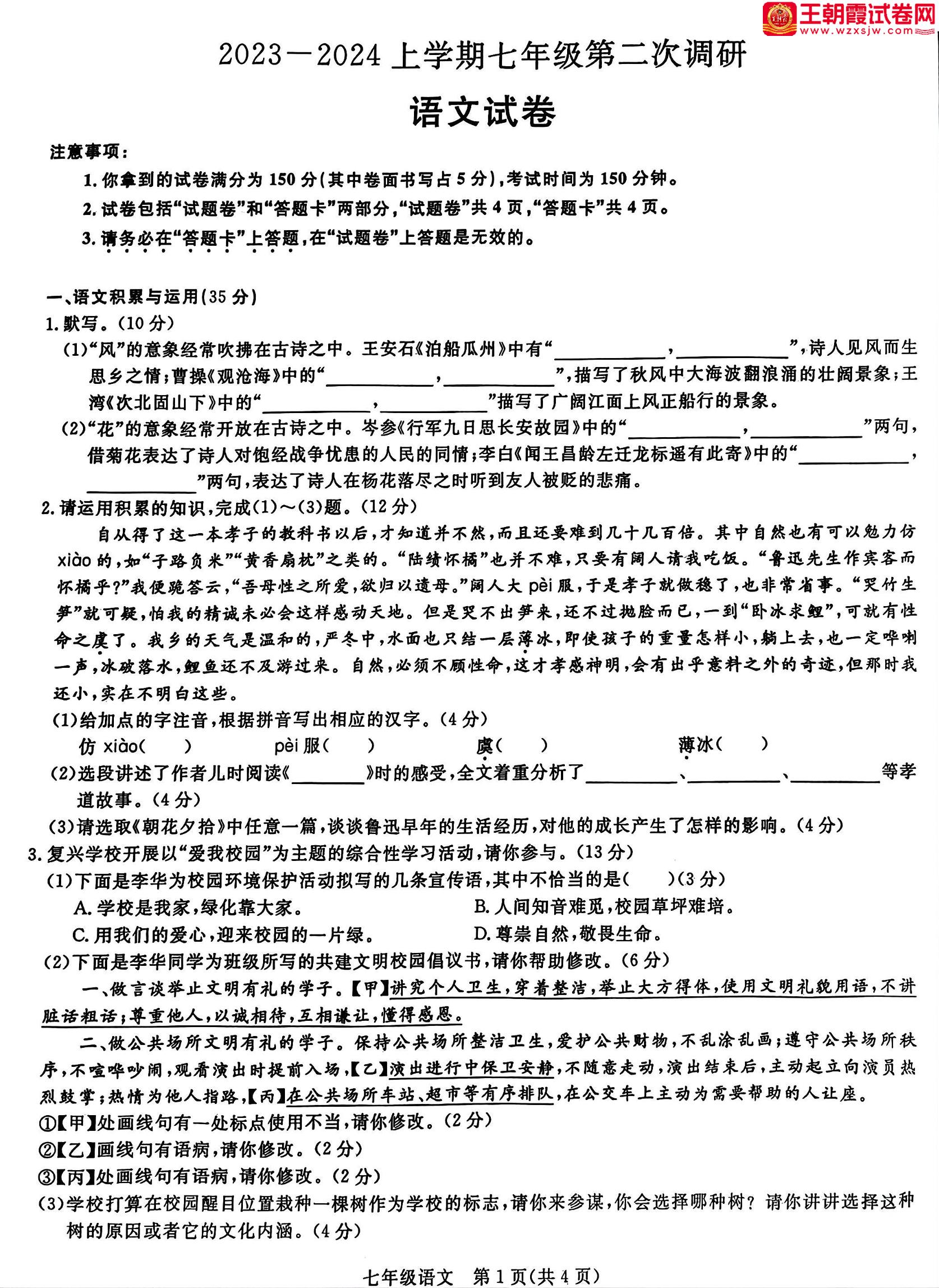 安徽省蚌埠市怀远县2023-2024学年上学期(期中)第二次调研试卷七年级语文(人教版)