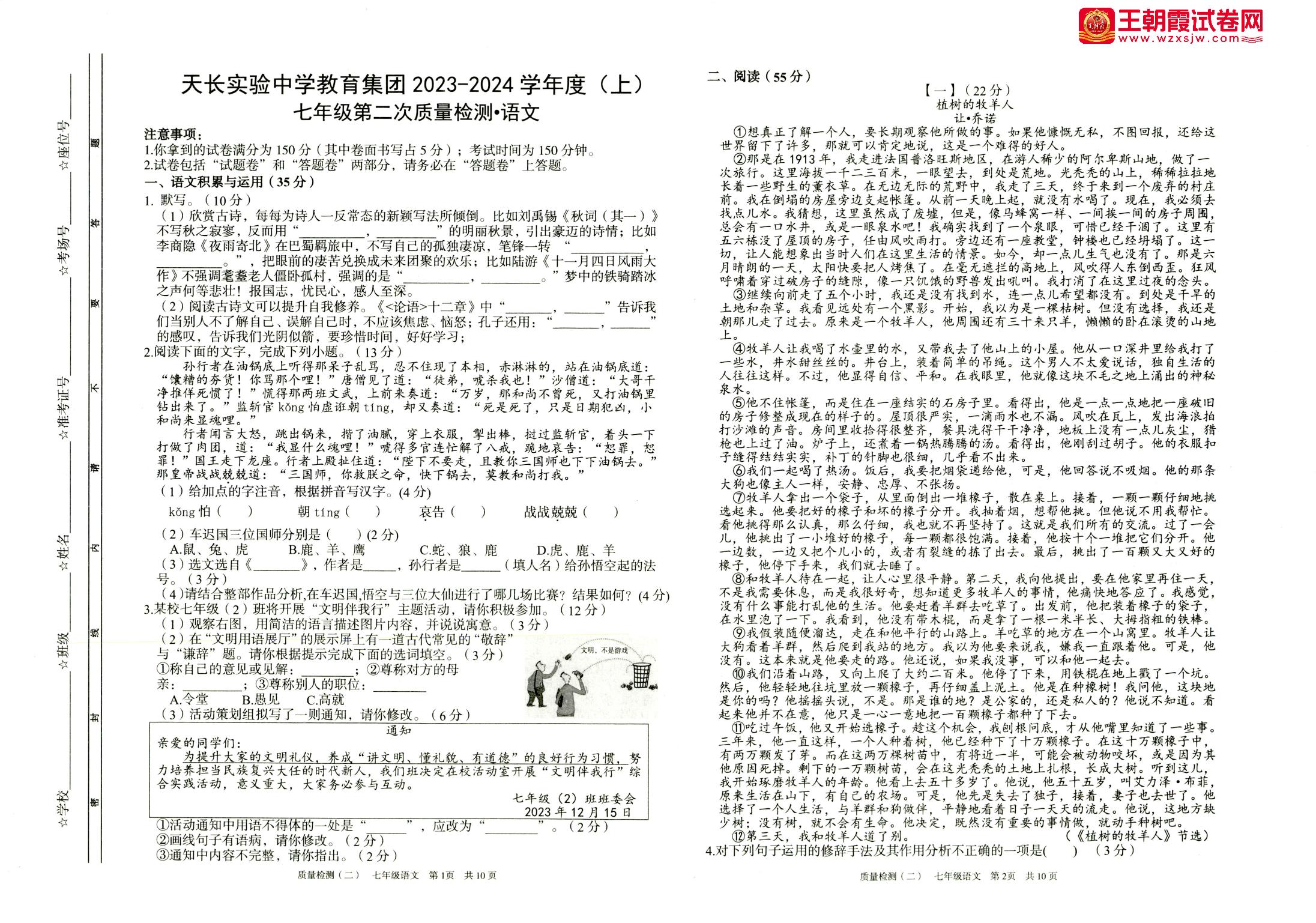 安徽省滁州市天长市实验中学教育集团2023-2024学年度上学期(期中)质量检测七年级语文(人教版)