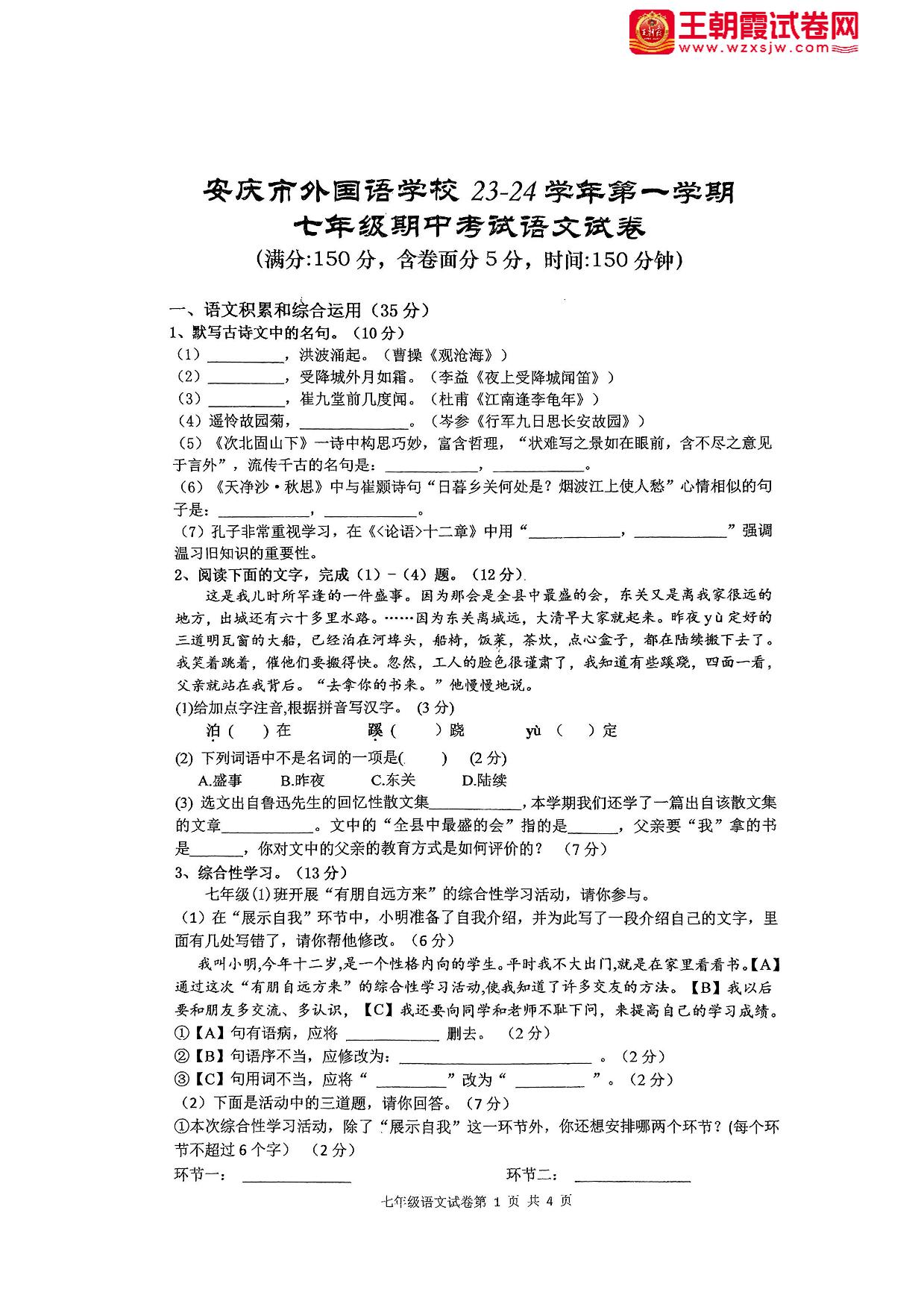 安徽省安庆市外国语学校2023-2024学年第一学期期中考试七年级语文(人教版)