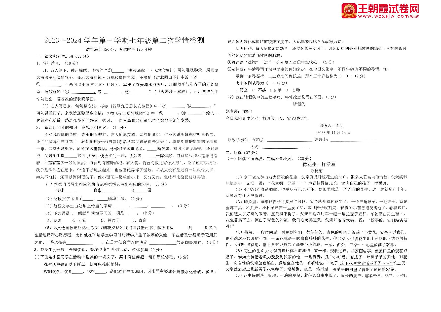 安徽省淮南市凤台县第四中学2023-2024学年第一学期(期中)第二次学情检测七年级语文(人教版)