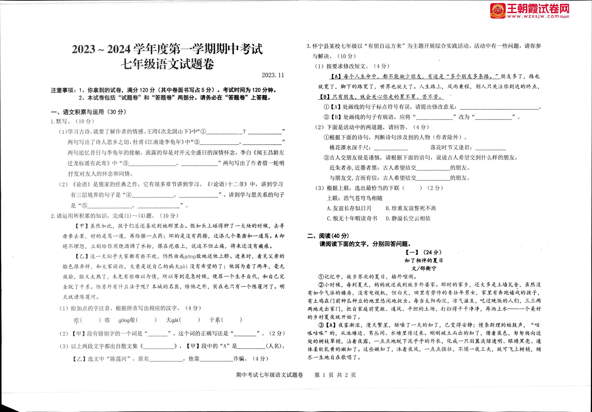 安徽省安庆市怀宁县2023-2024学年度第一学期期中考试七年级语文(人教版)