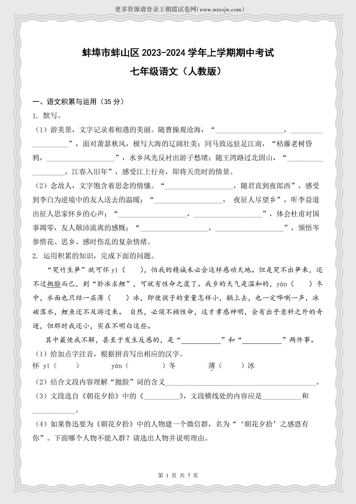 安徽省蚌埠市蚌山区2023-2024学年上学期期中考试七年级语文(人教版)