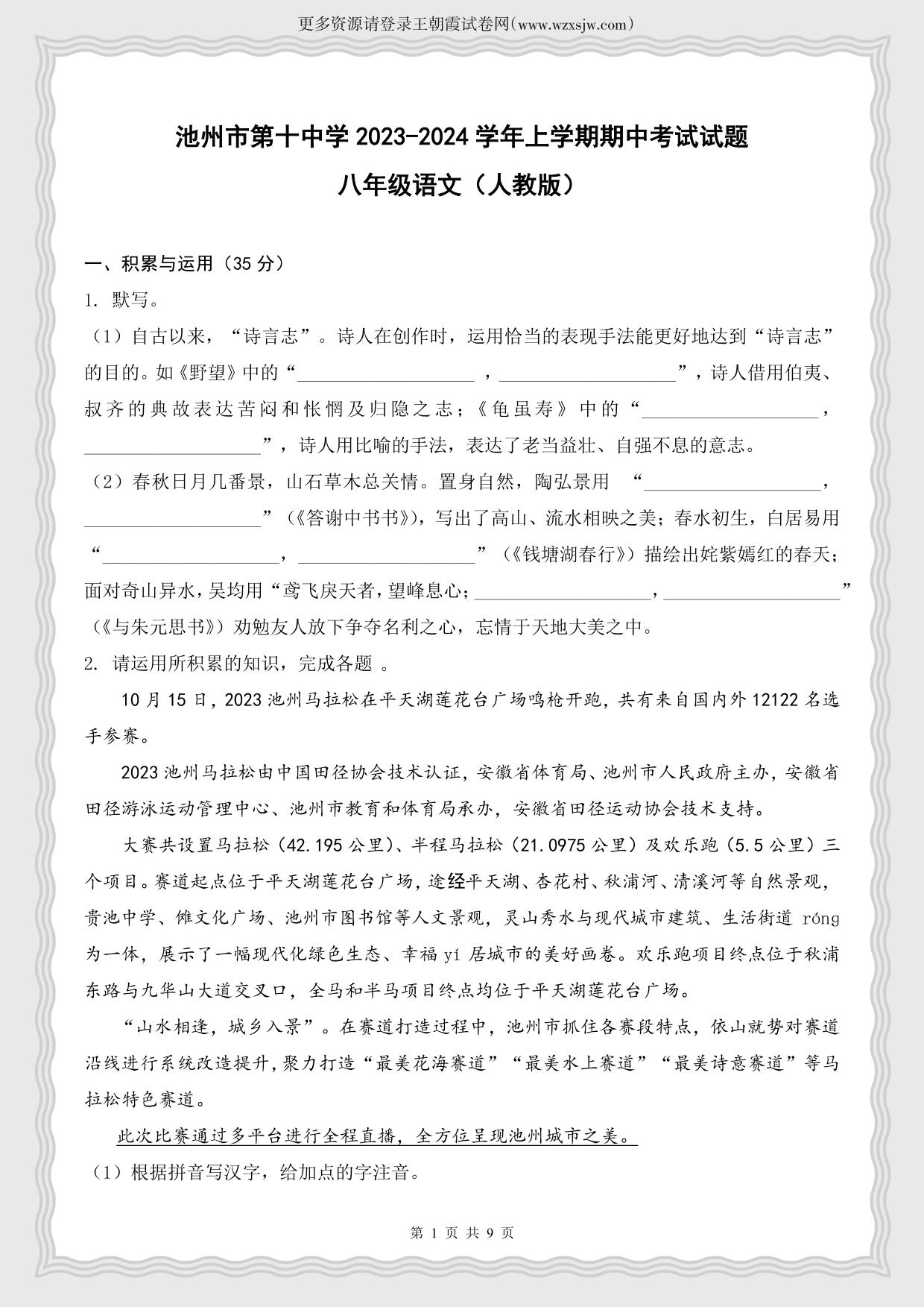安徽省池州市第十中学2023—2024学年上学期期中考试试题八年级语文(人教版)
