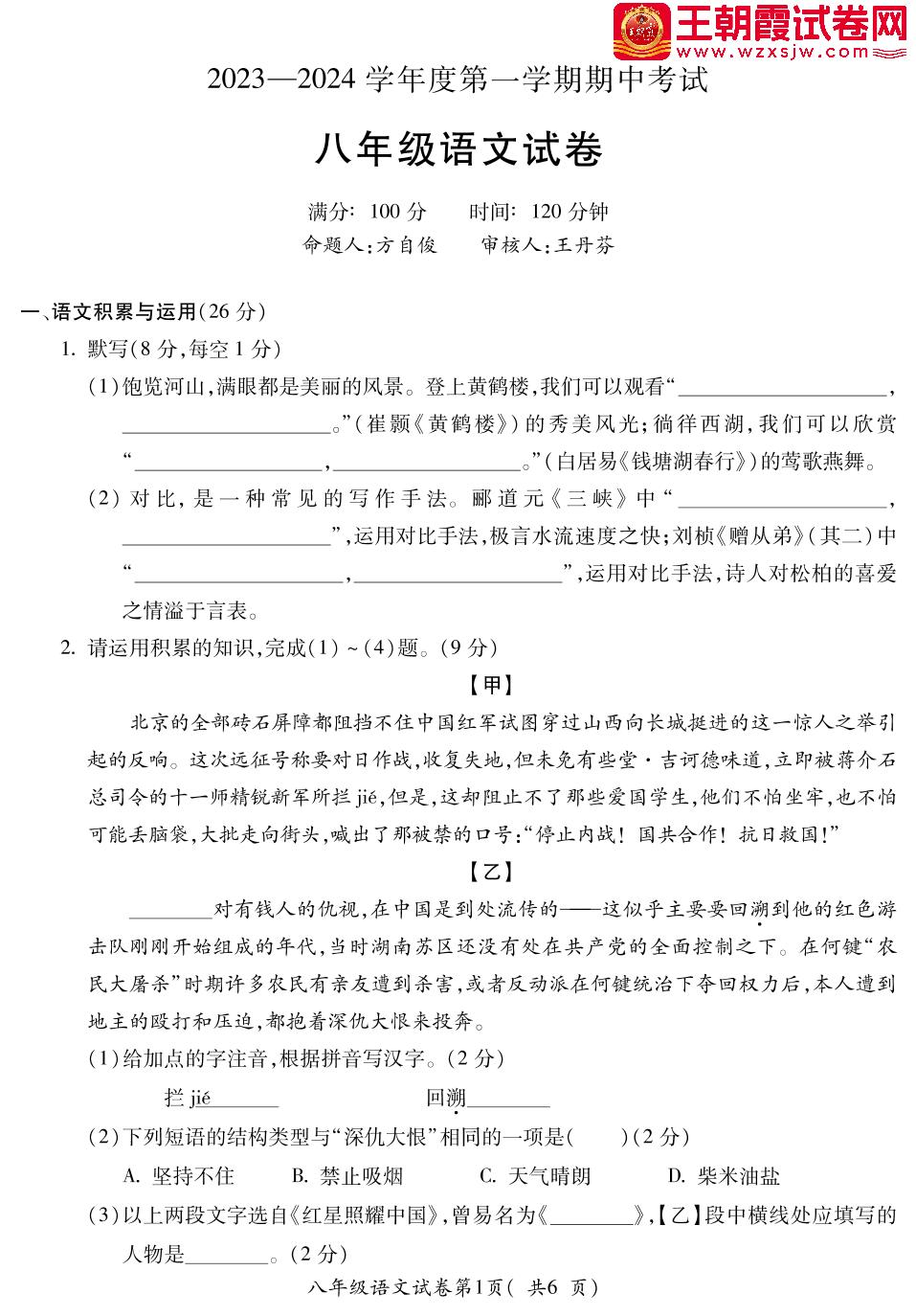安徽省宣城市第六中学2023-2024学年度第一学期期中考试八年级语文(人教版)