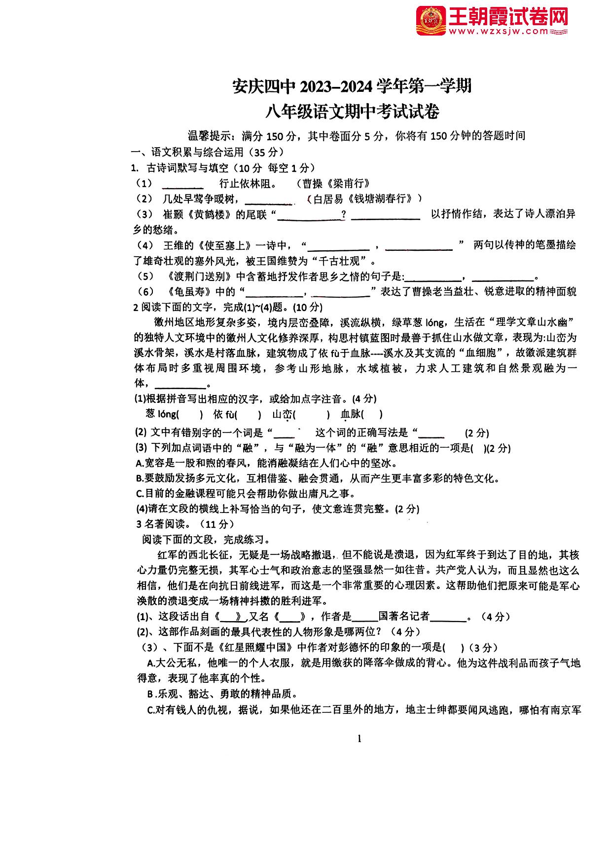 安徽省安庆市第四中学2023-2024学年第一学期期中考试试卷八年级语文(人教版)
