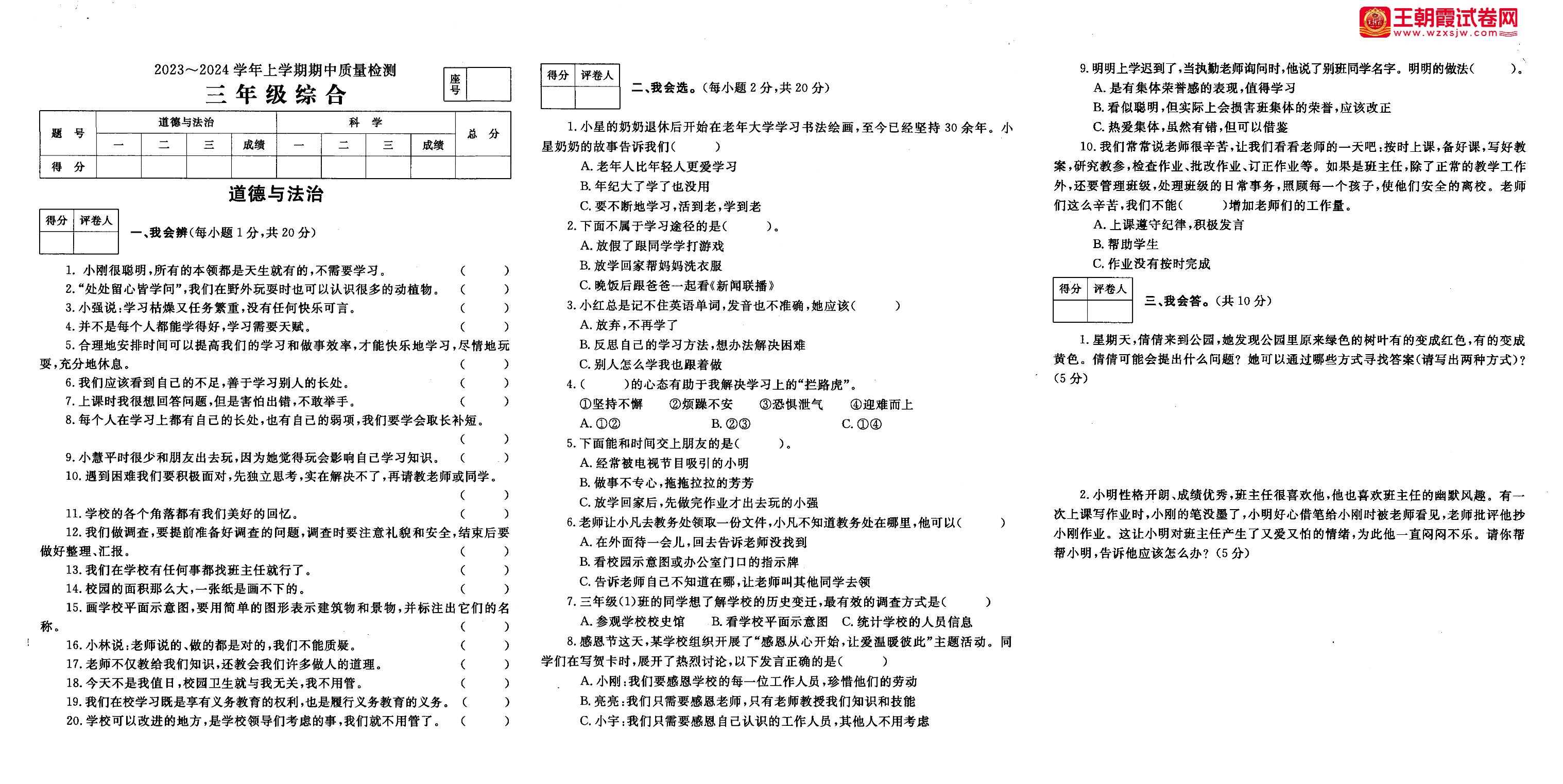 三年级道德与法治人教版上册期中卷