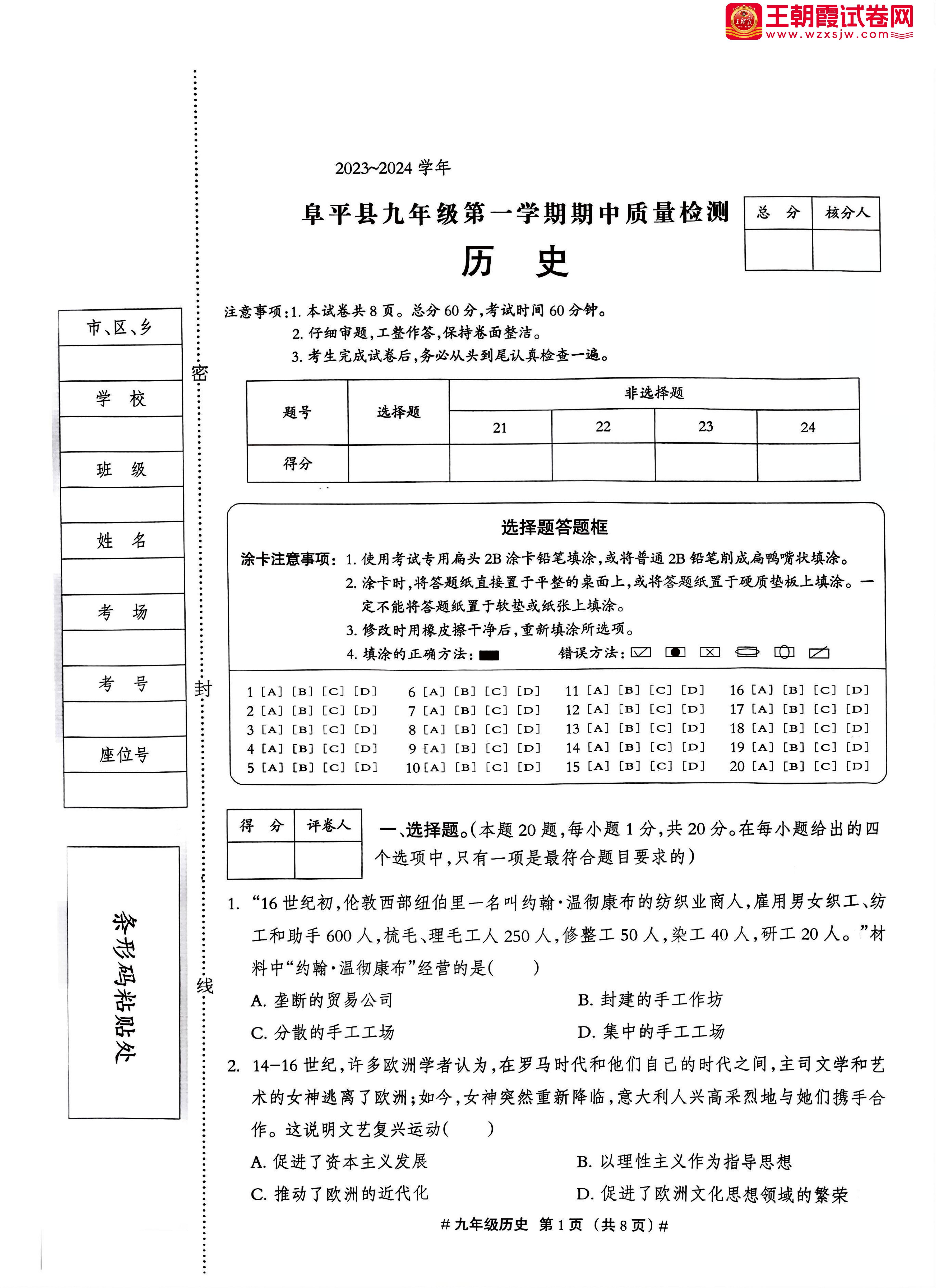 河北省保定市阜平县2023-2024学年第一学期期中质量检测九年级历史(人教版)