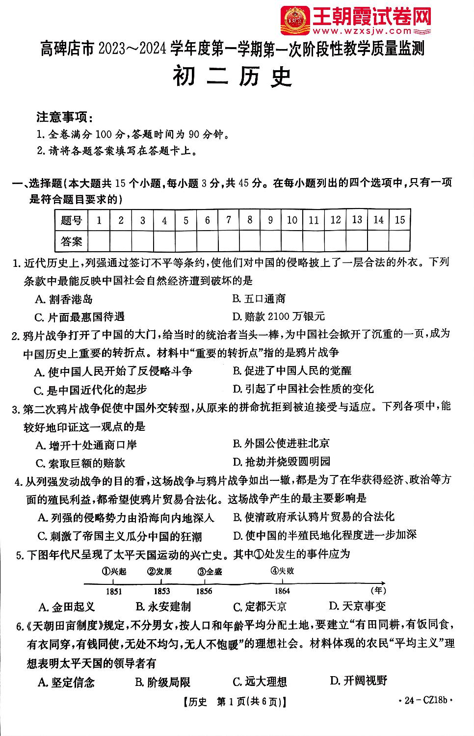 河北省保定市高碑店市2023-2024学年度第一学期第一次阶段性教学质量监测(月考)八年级历史(人教版)
