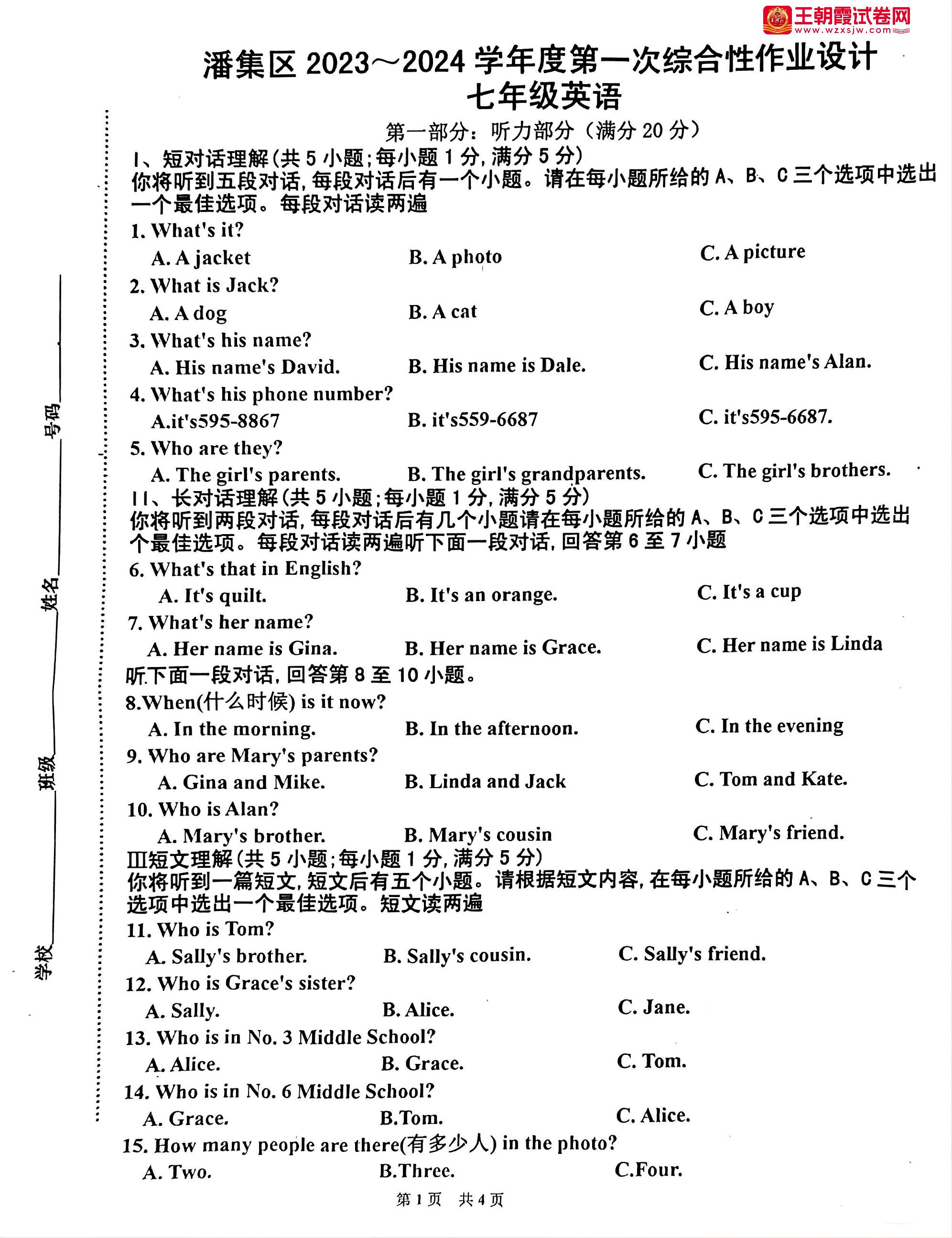 安徽省淮南市潘集区2023-2024学年度上学期(月考)第一次综合性作业设计七年级英语(人教版)【无听力音频】
