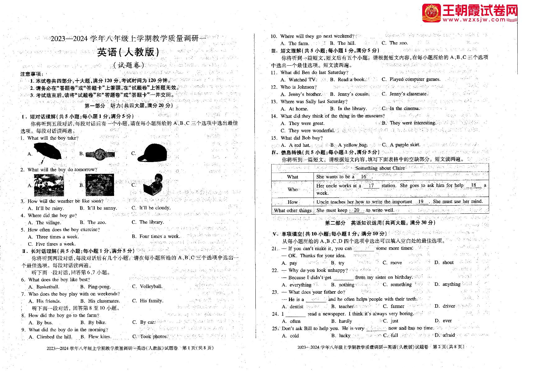 安徽省六安市霍邱县2023-2024学年上学期(月考)教学质量调研八年级英语(人教版)