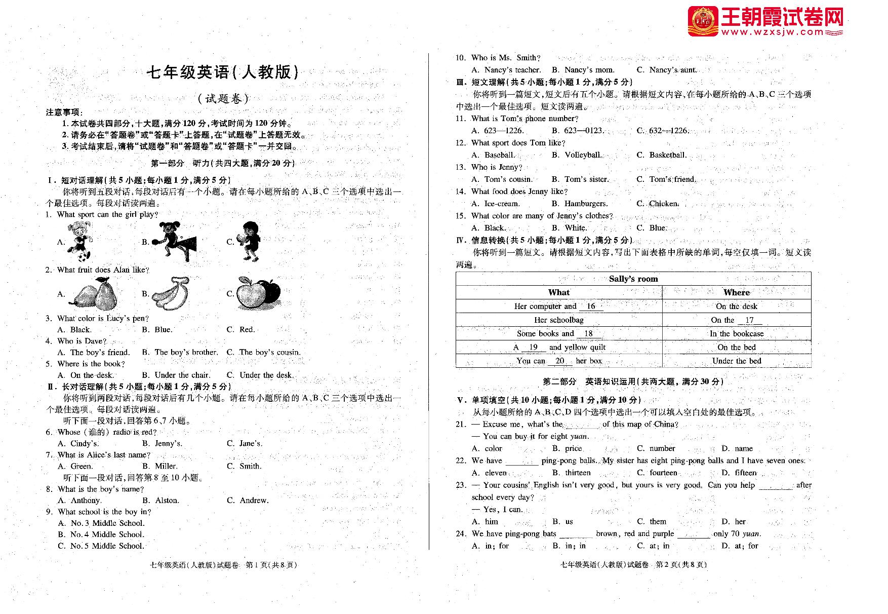 七年级英语人教版上册月考卷