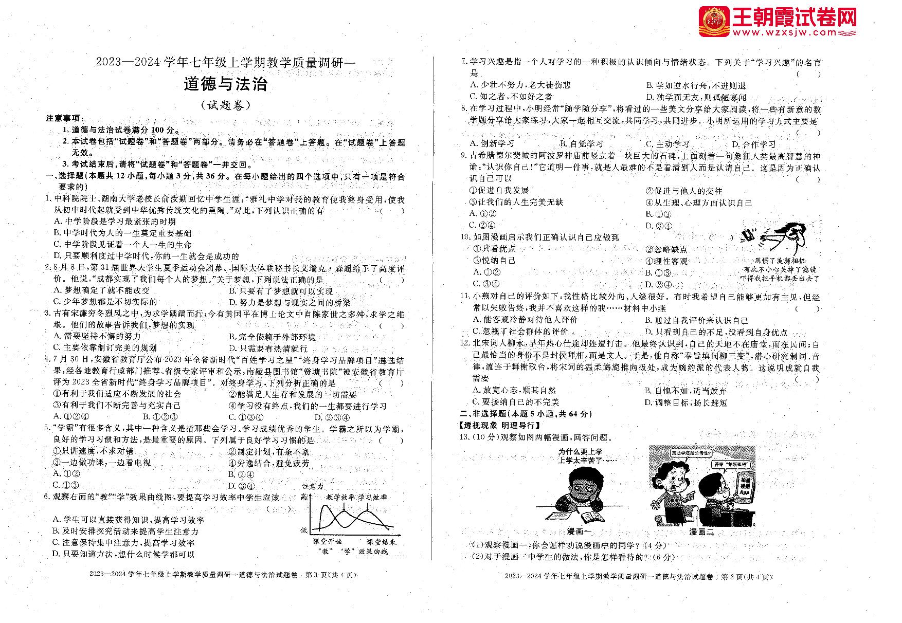 安徽省六安市霍邱县2023-2024学年上学期(月考)教学质量调研一七年级道德与法治(人教版)