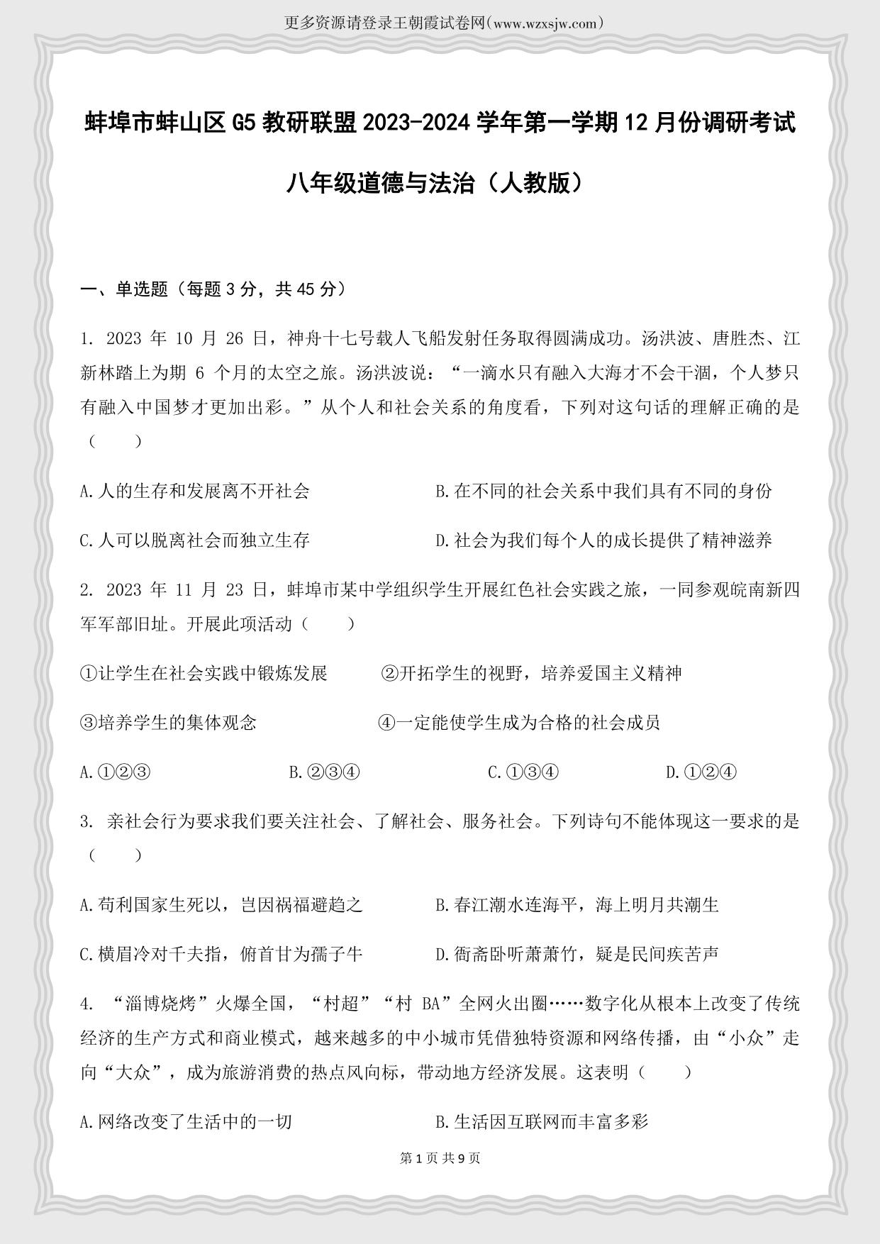 安徽省蚌埠市蚌山区G5教研联盟2023-2024学年第一学期(月考)12月份调研考试八年级道德与法治(人教版)
