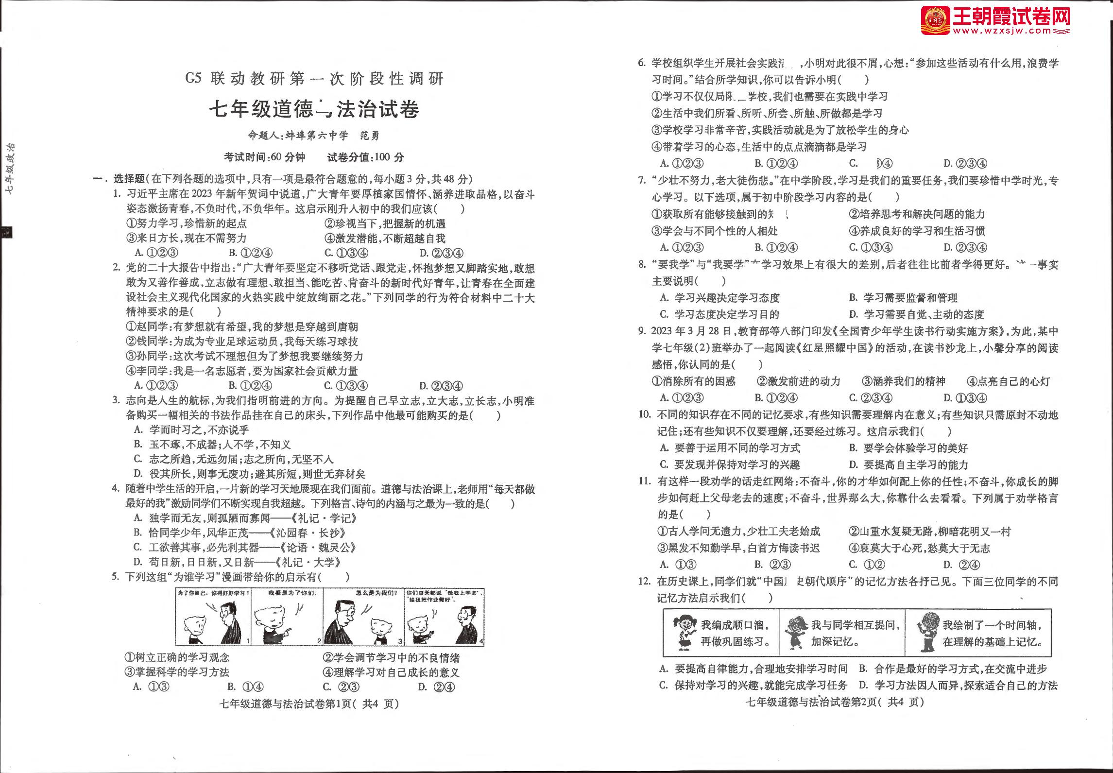 安徽省蚌埠市G5联动教研2023-2024学年上学期(月考)第一次阶段性调研七年级道德与法治(人教版)
