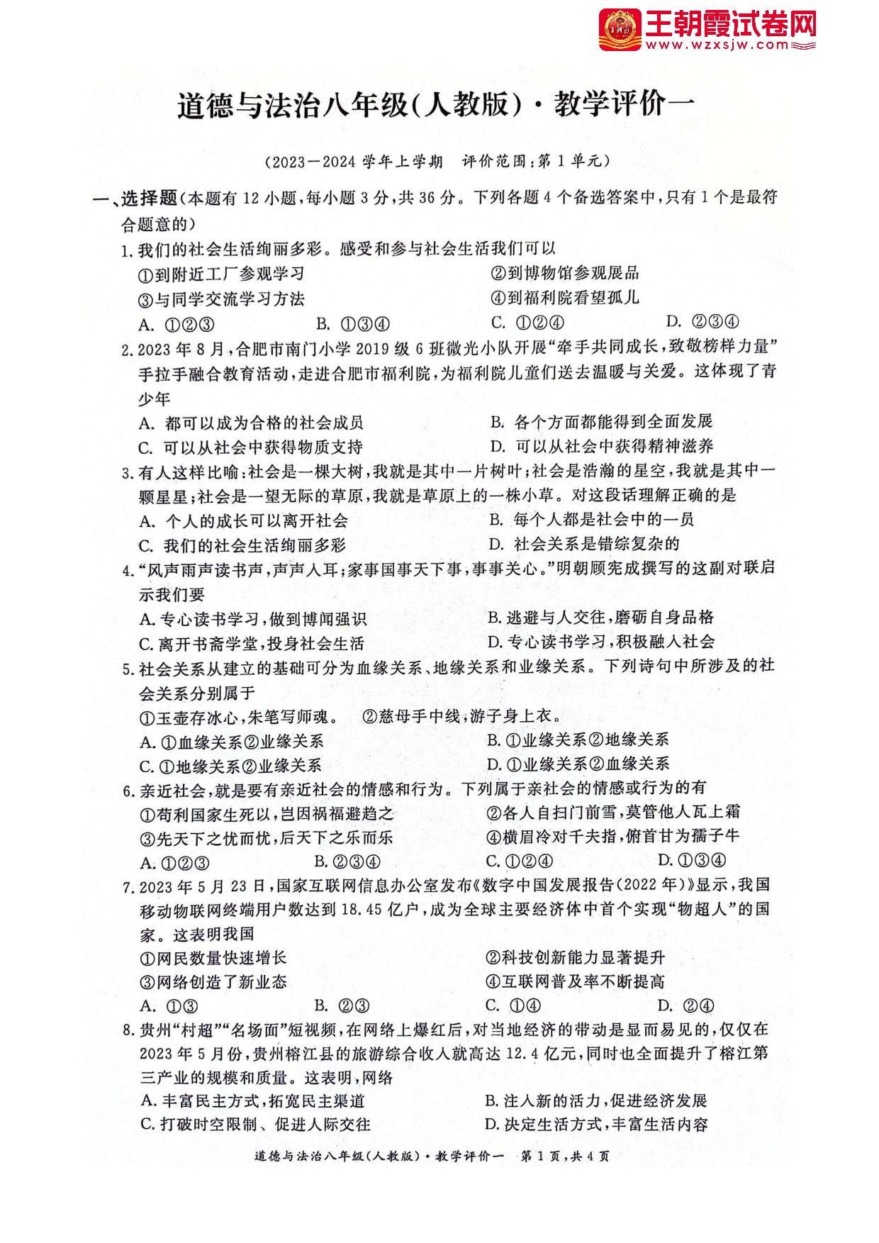 八年级道德与法治人教版上册月考卷