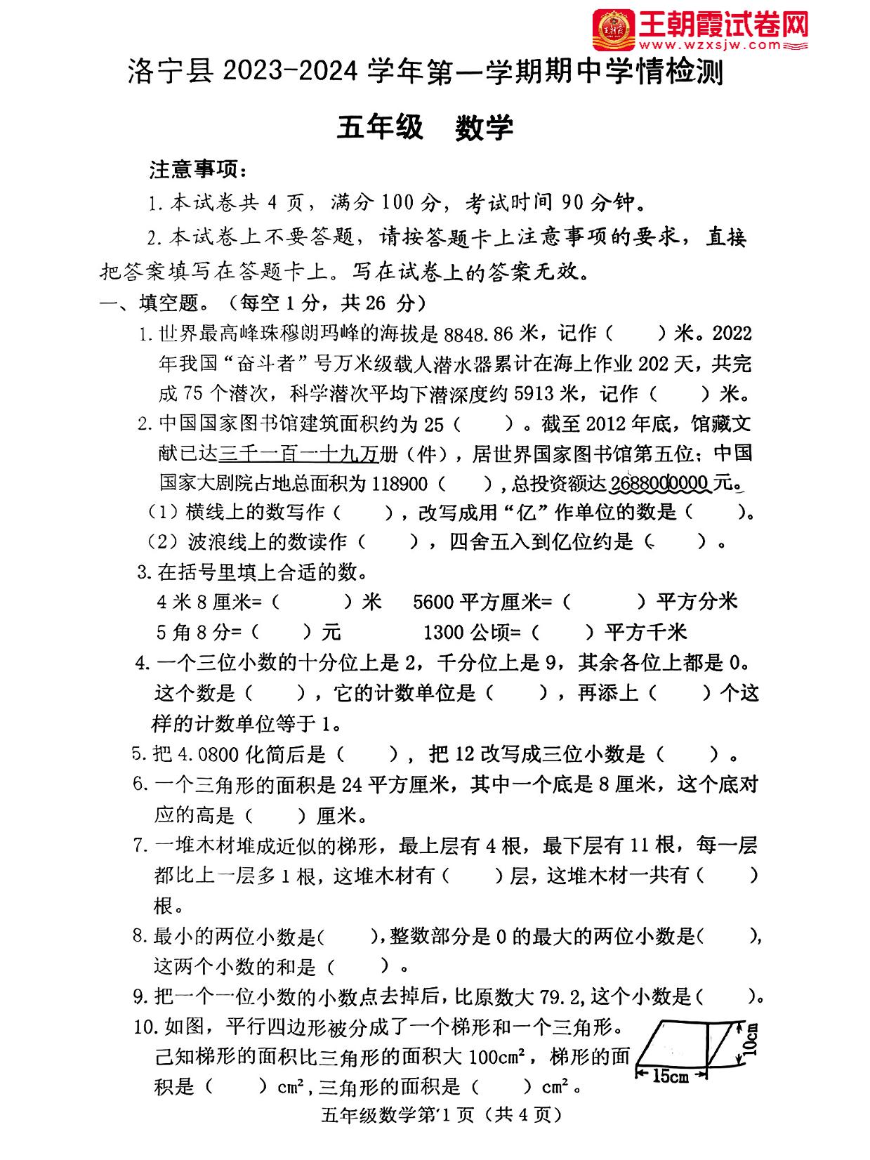 河南省洛阳市洛宁县2023-2024学年第一学期期中学情检测试卷五年级数学(苏教版)