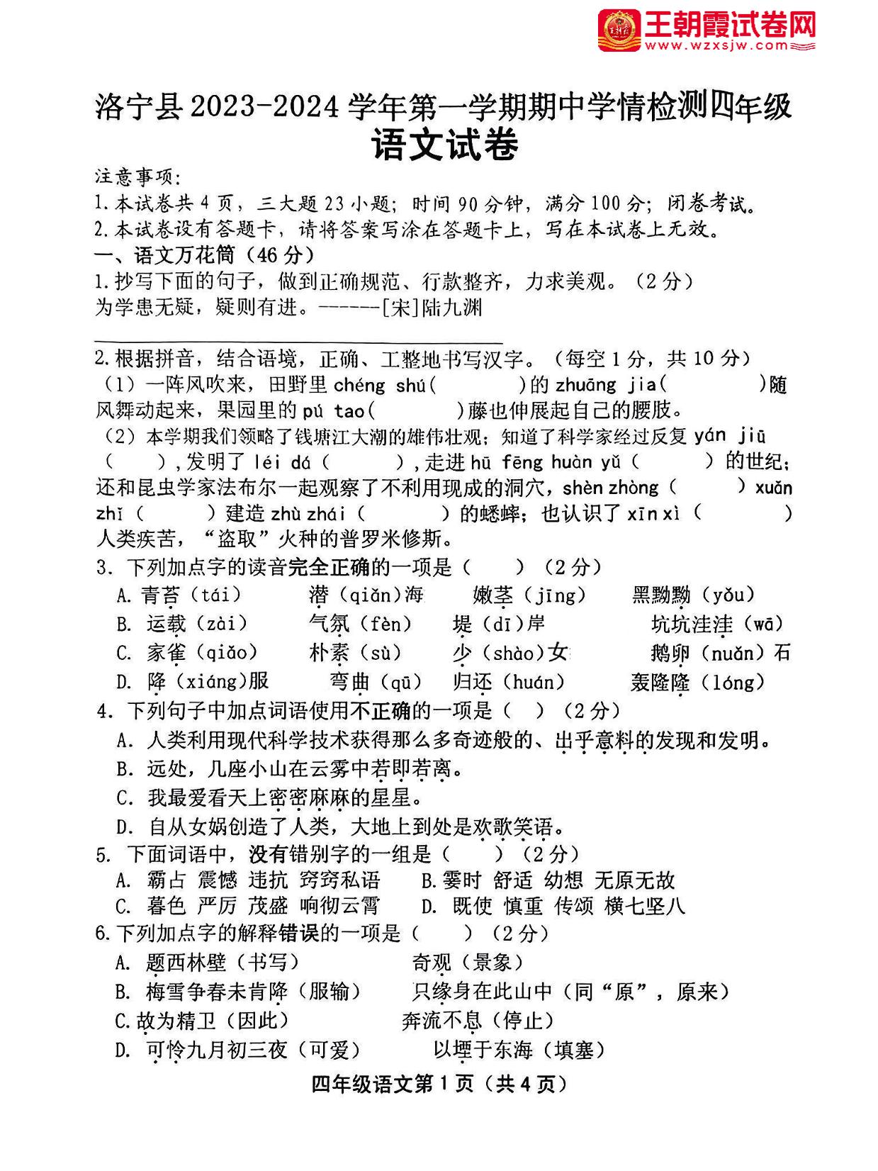 河南省洛阳市洛宁县2023-2024学年第一学期期中学情检测试卷四年级语文(人教版)