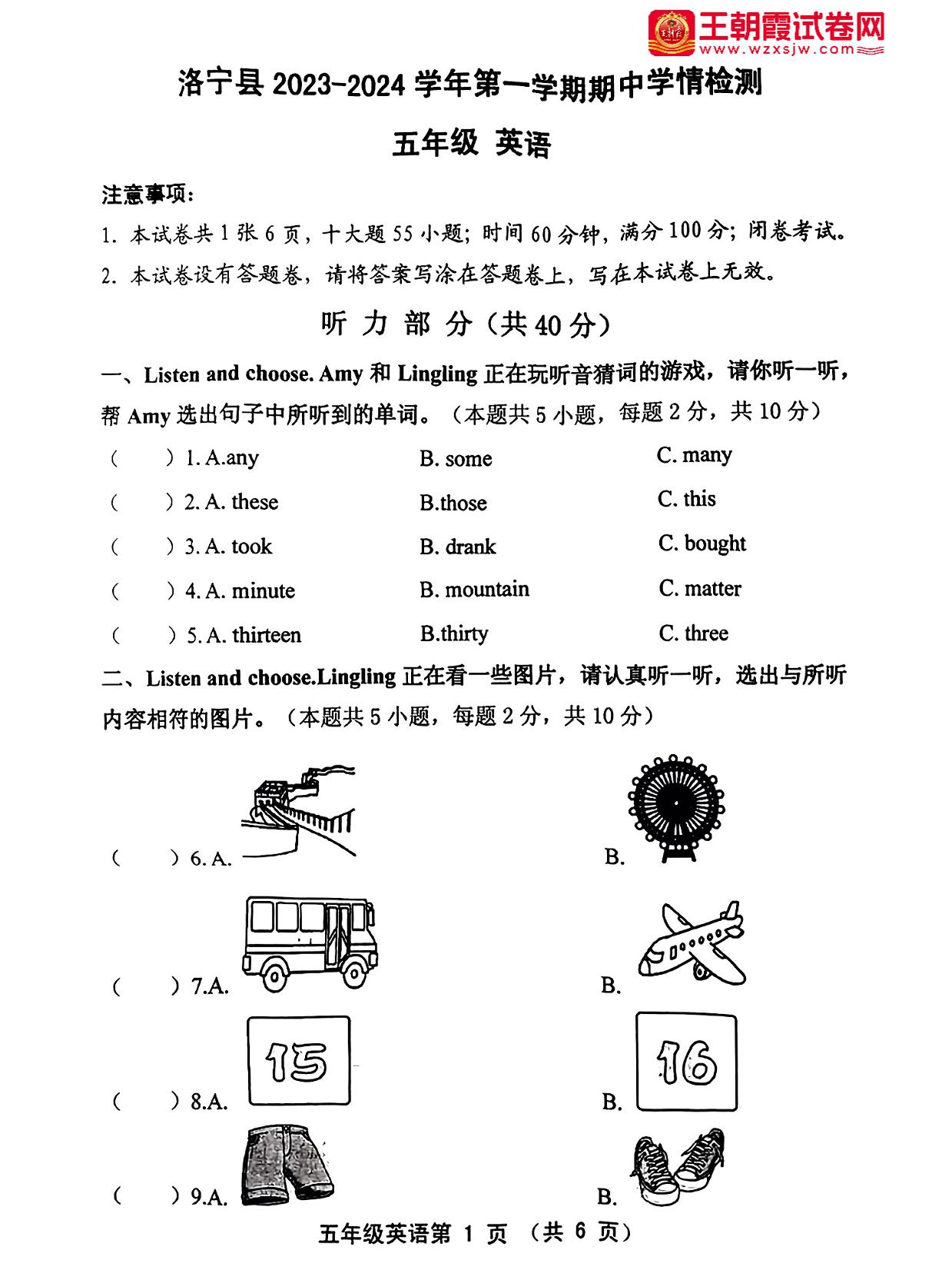 河南省洛阳市洛宁县2023-2024学年第一学期期中学情检测试卷五年级英语(外研版·三起始)