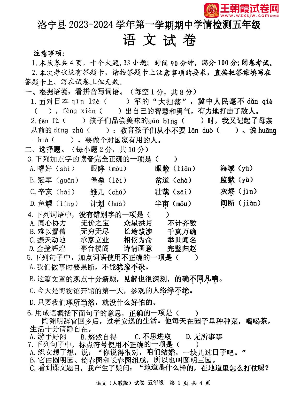 河南省洛阳市洛宁县2023-2024学年第一学期期中学情检测试卷五年级语文(人教版)