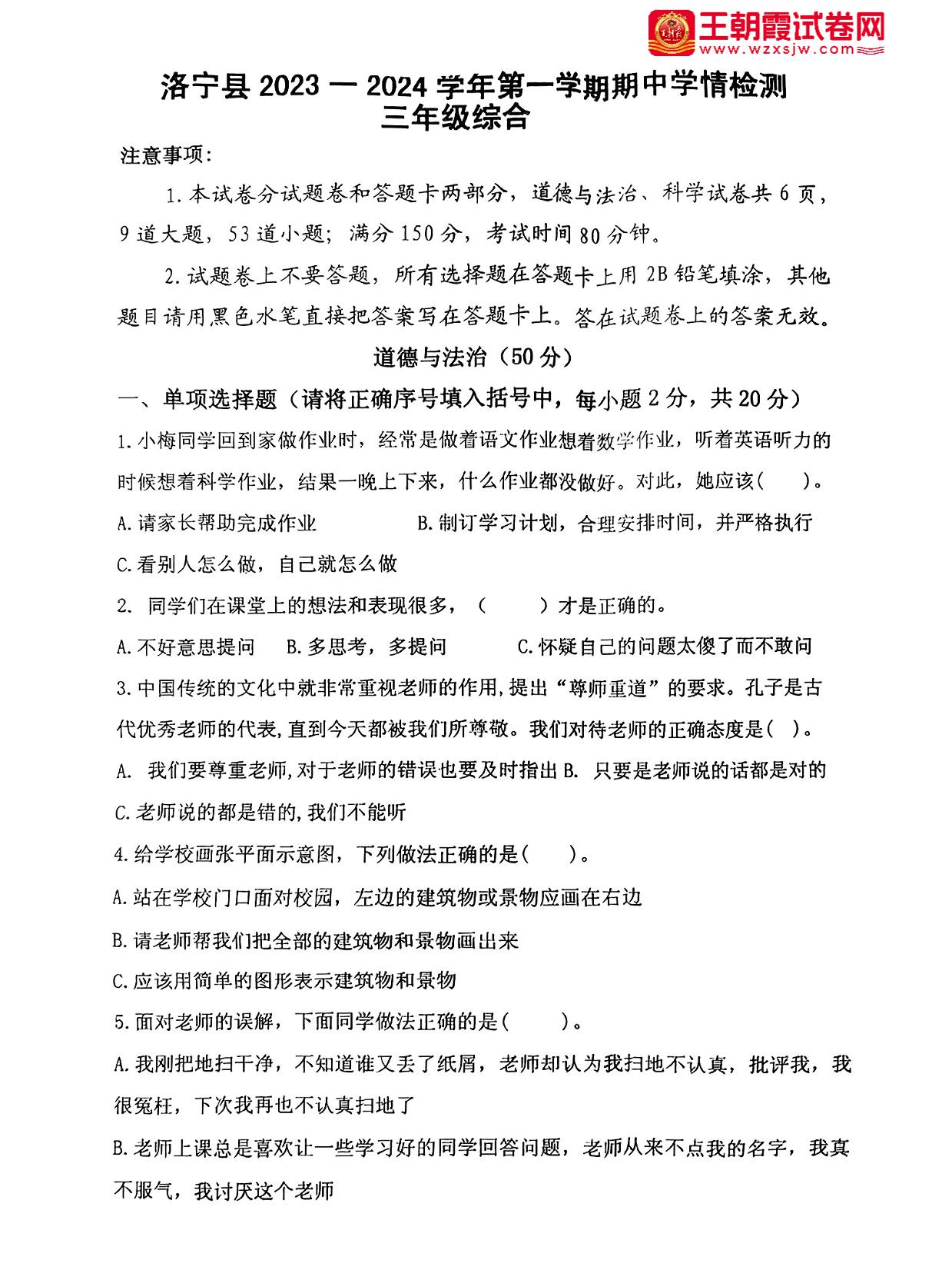 河南省洛阳市洛宁县2023-2024学年第一学期期中学情检测试卷三年级道德与法治(人教版)