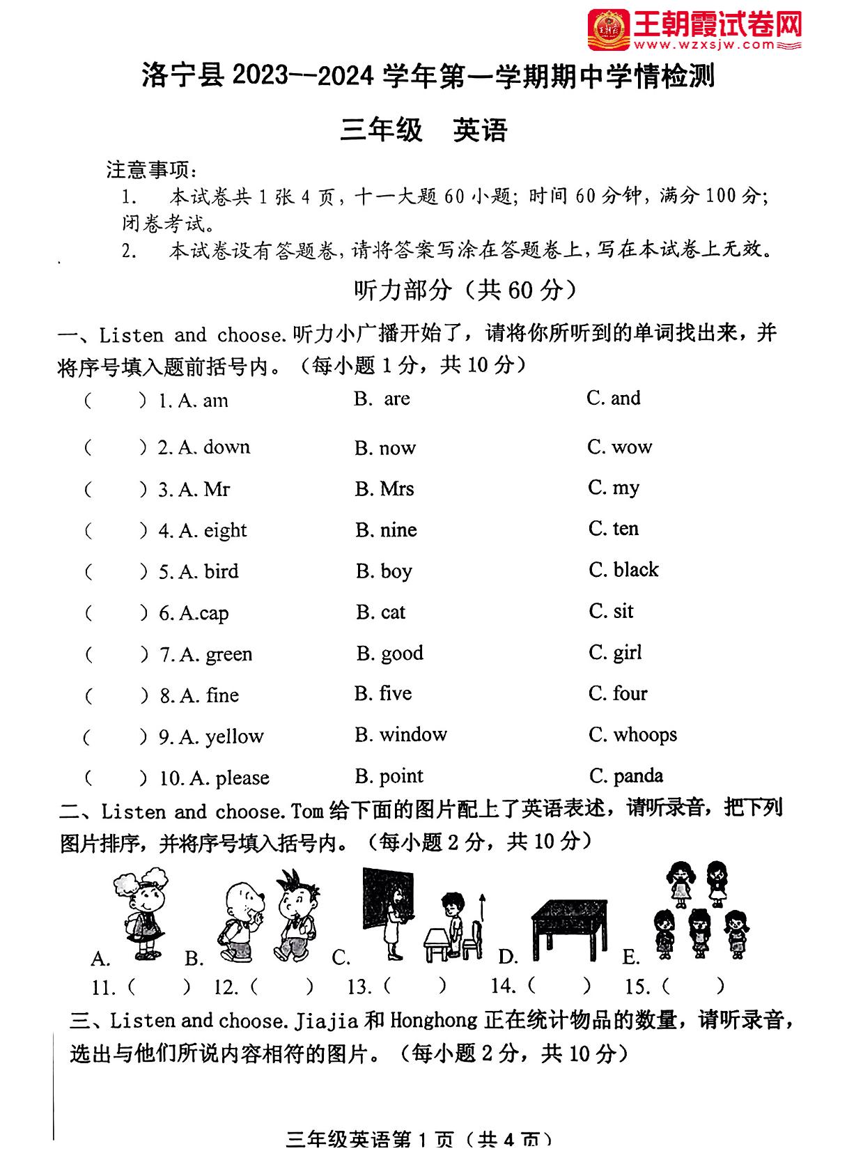 河南省洛阳市洛宁县2023-2024学年第一学期期中学情检测试卷三年级英语(外研版·三起始)