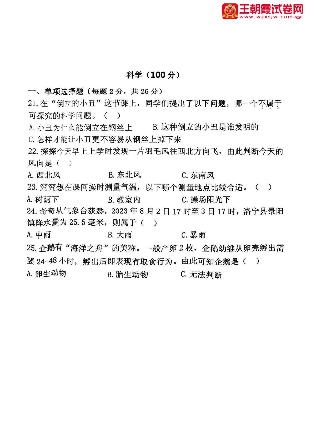 河南省洛阳市洛宁县2023-2024学年第一学期期中学情检测试卷三年级科学(大象版)