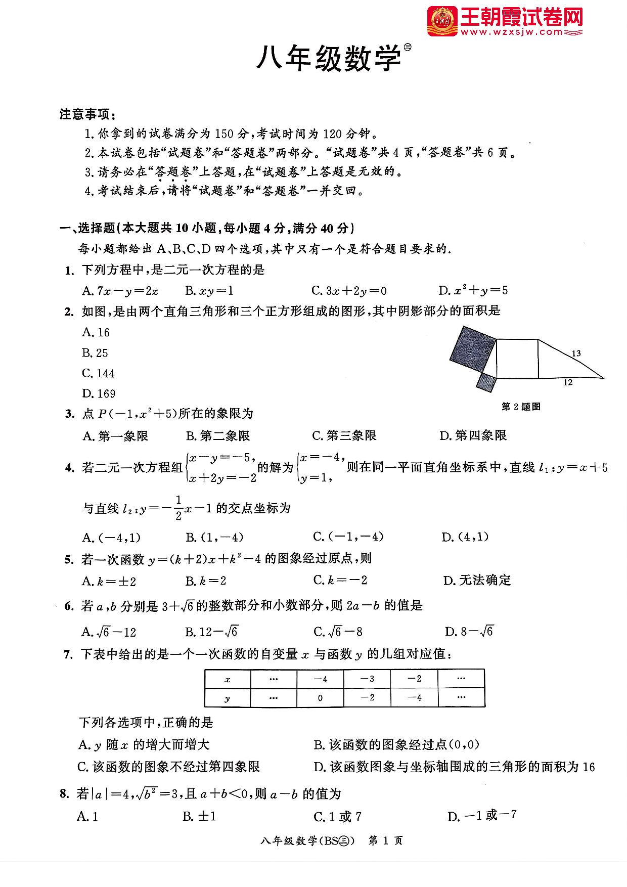 八年级数学北师版上册月考卷
